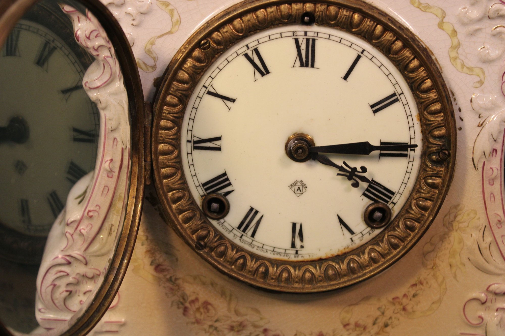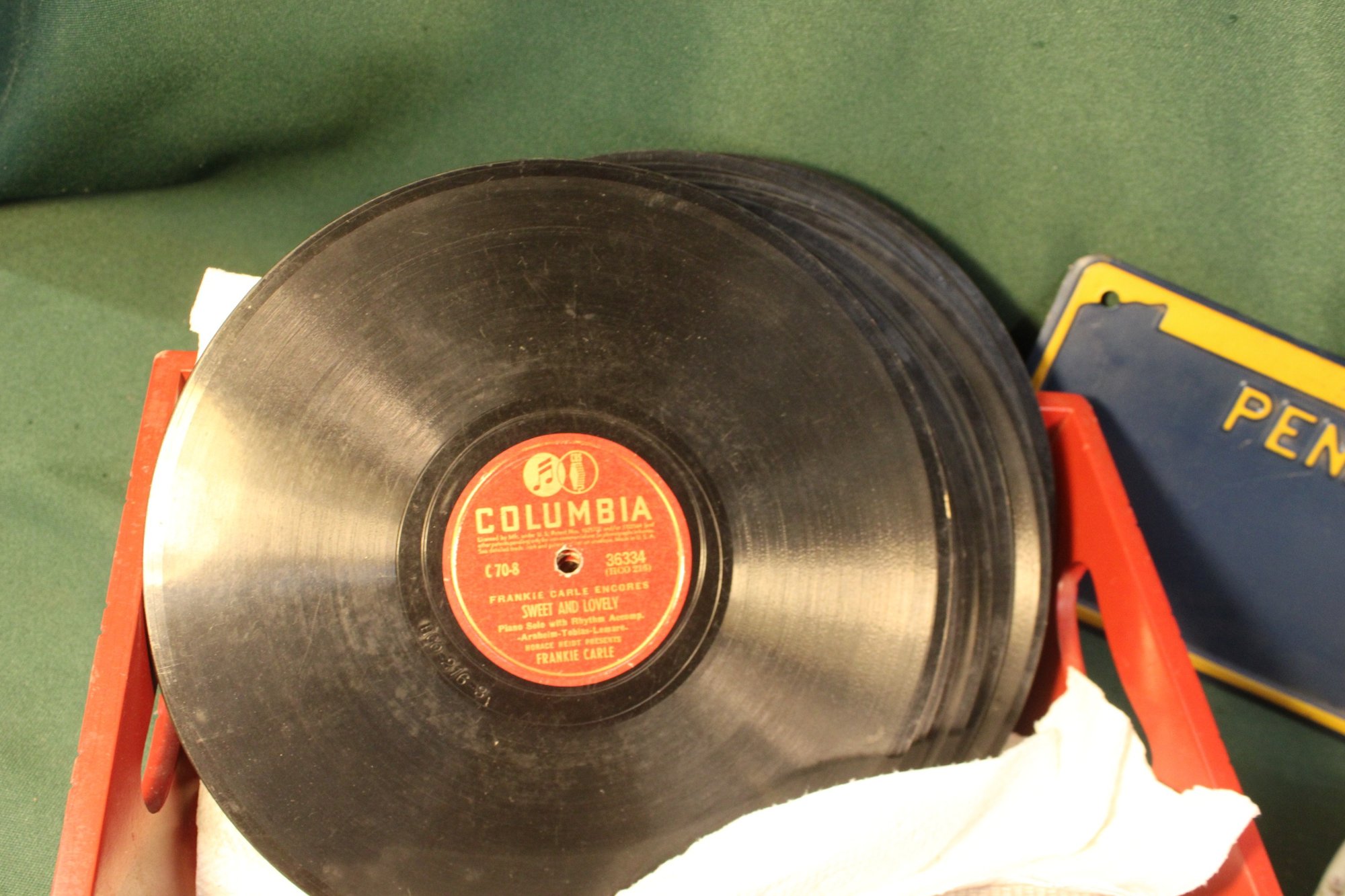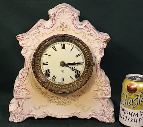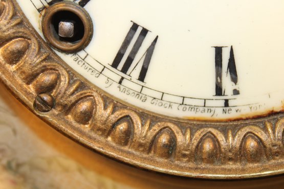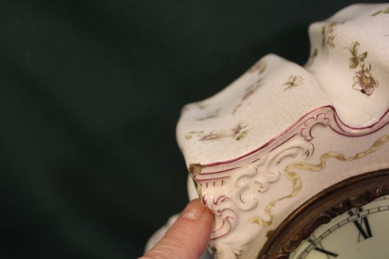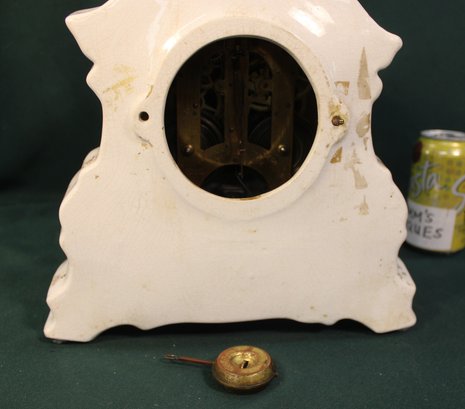 Ansonia China Shelf Clock, W/ Pendulum, No Key Or Back Plate, 3 Chipped Corners & 32 Assorted 78RPM Rec (334)