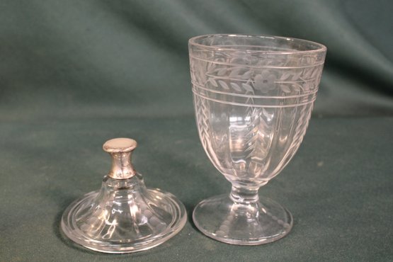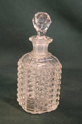 Perfume is cut glass "Diamond" pattern w/faceted stopper, small chip in top of perfume bottle.