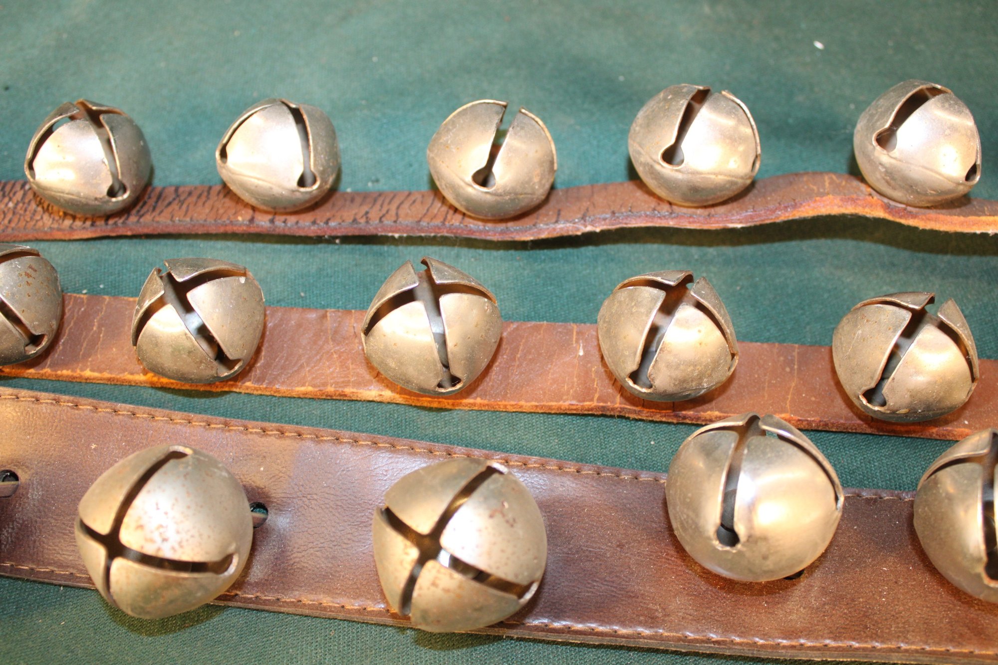 Antique 3 Sets Sleigh Bells On Leather Straps - 5,7 & 11 Bells/set (283)