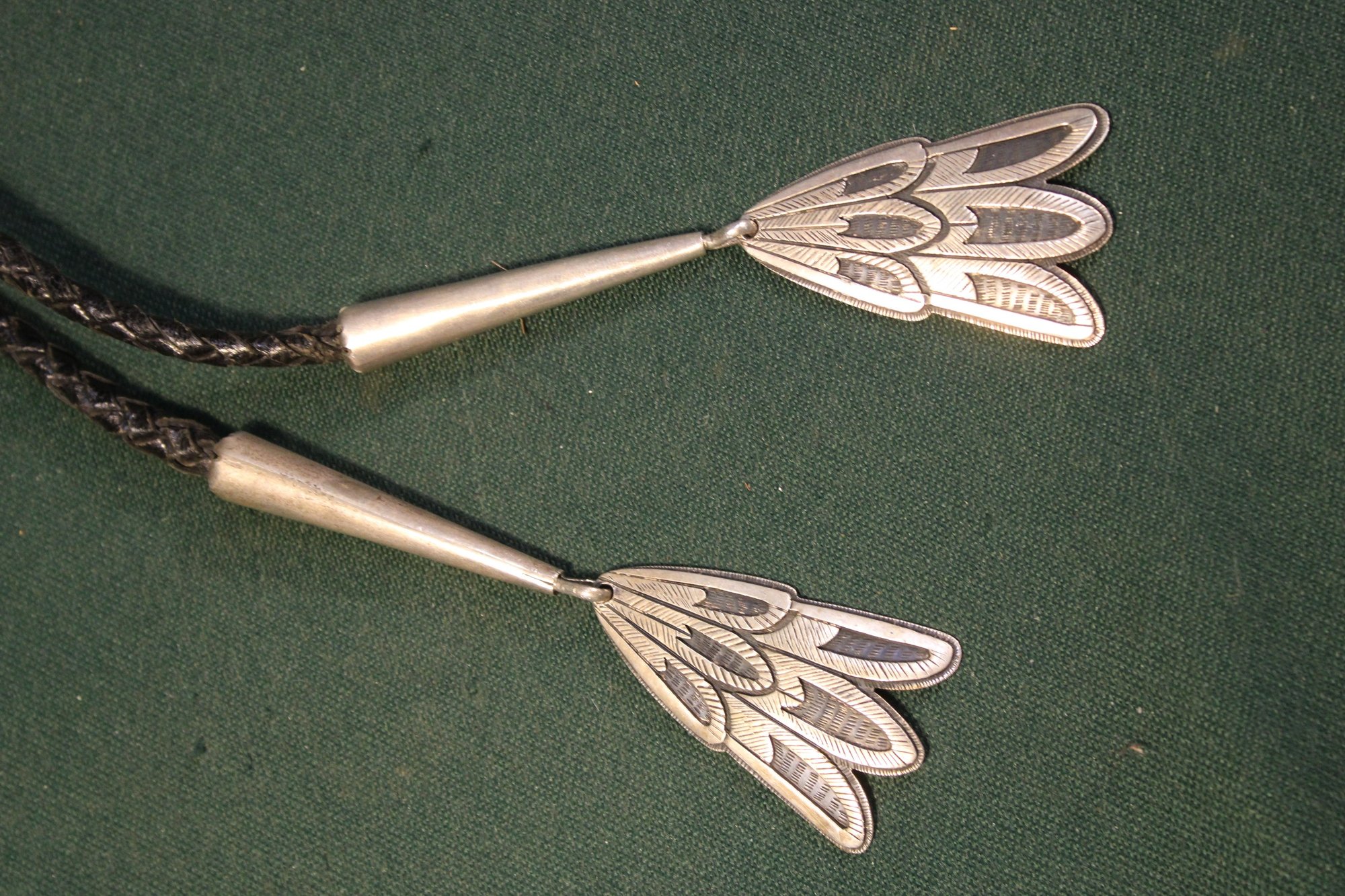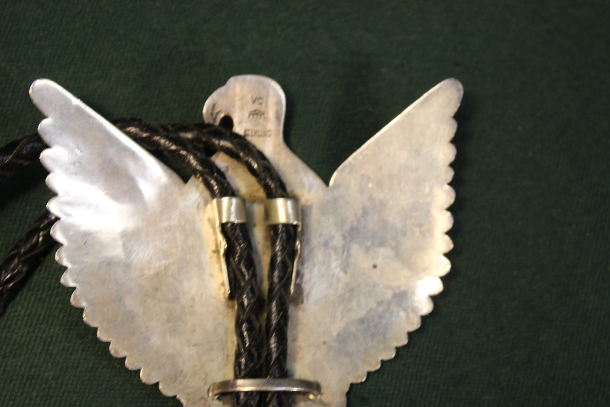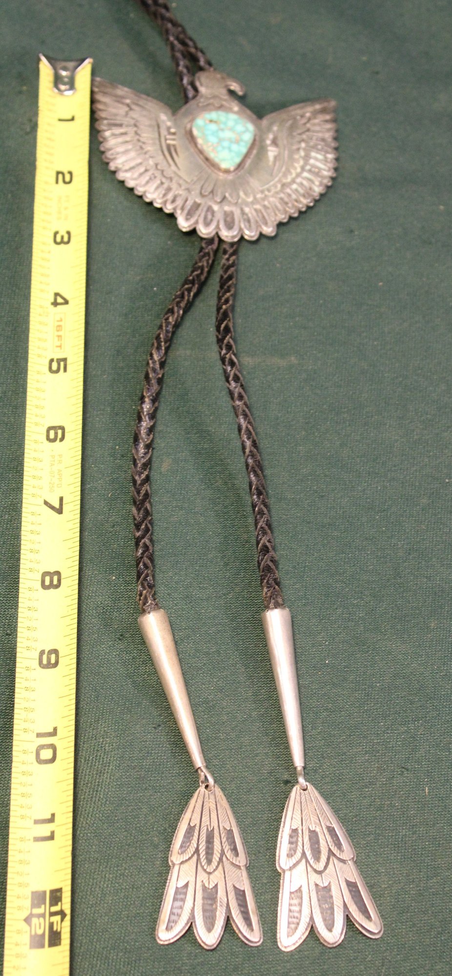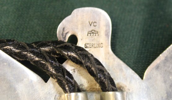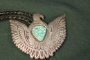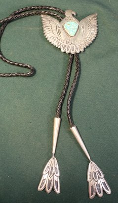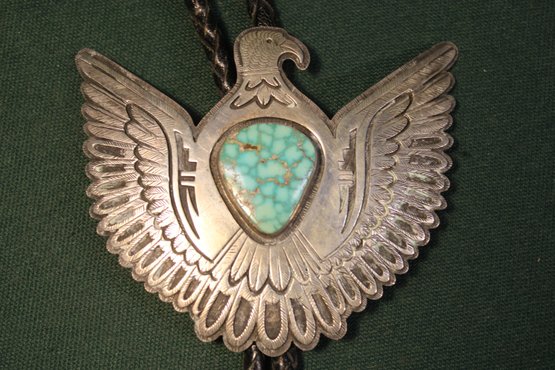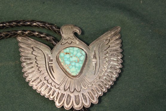 Antique Engraved Sterling, Turquoise & Leather Thunderbird Bolo Tie, Sgnd VC, 3.32OZT(181)