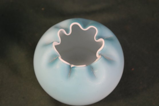 Antique Hand Blown Blue & White Cased Glass Ruffled Edge Rose Bowl (249)