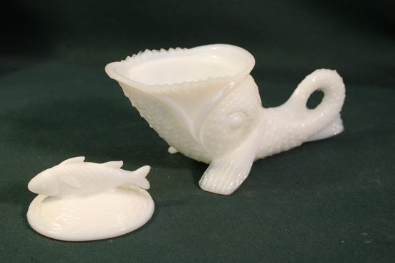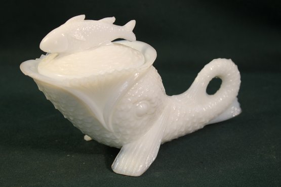 Antique Milk Glass Fish Eating Another Fish Covered Trinket Box, 8" Long, 3" High (230)