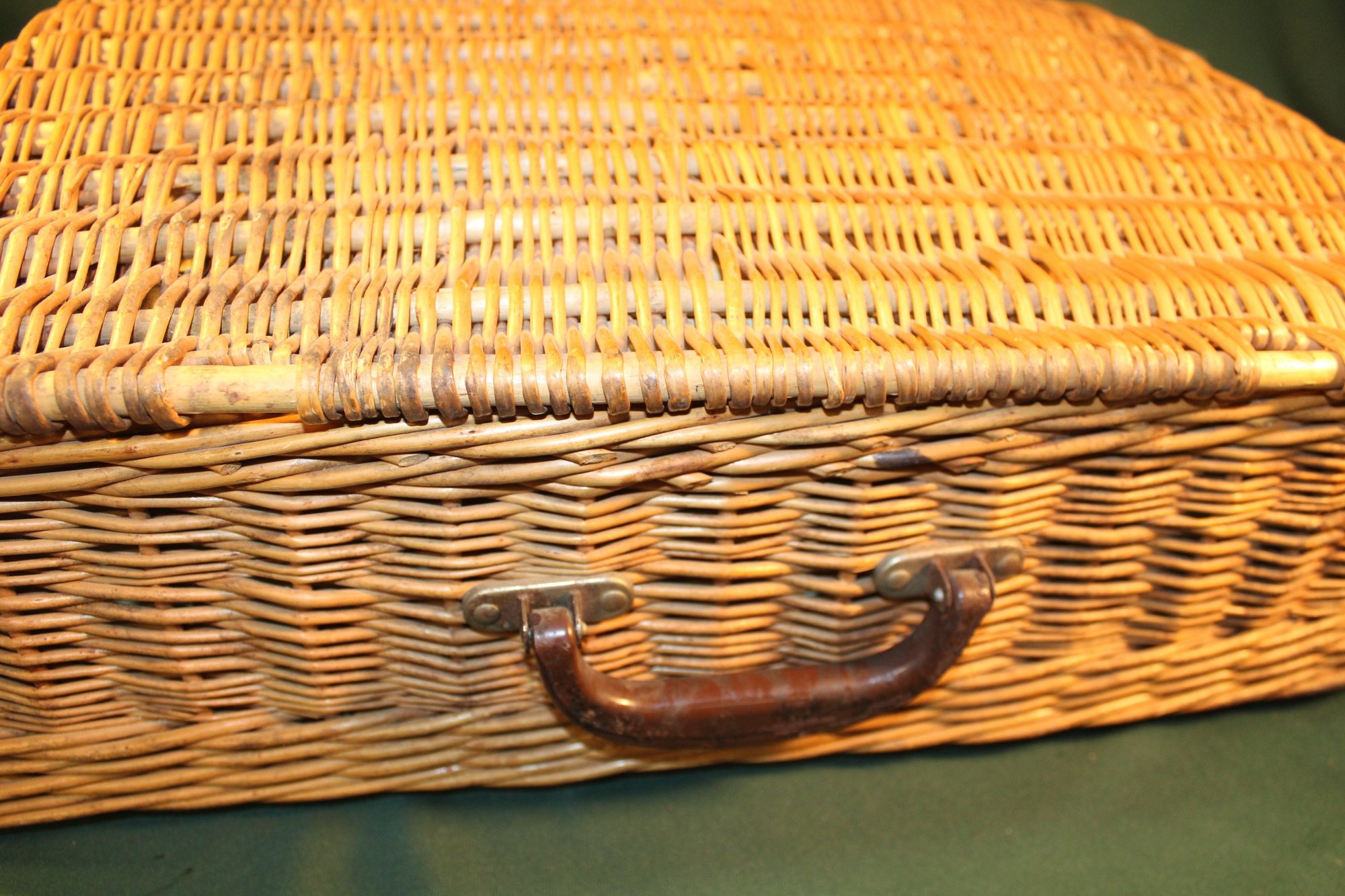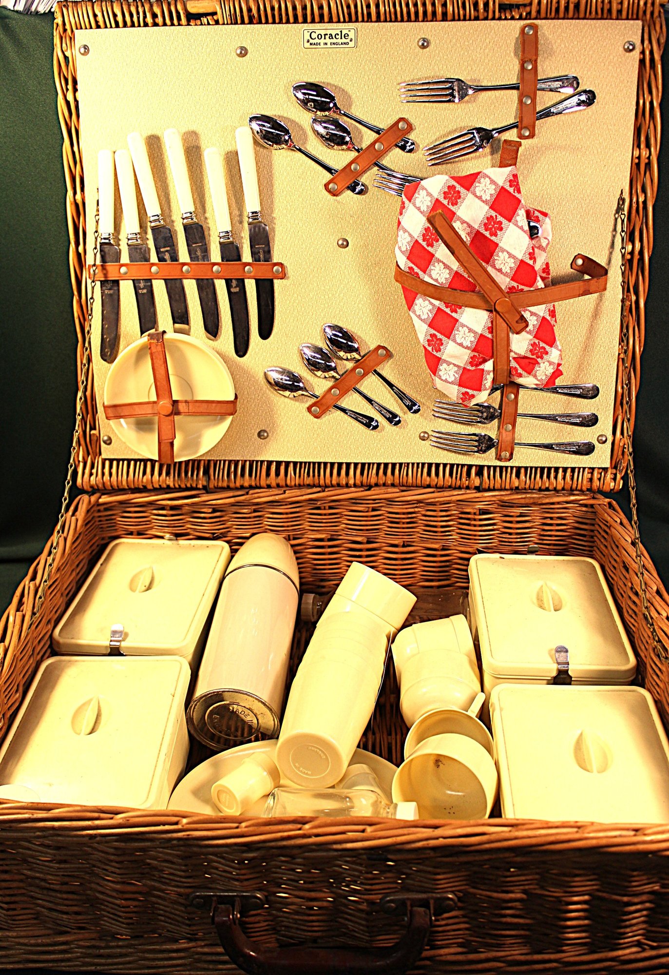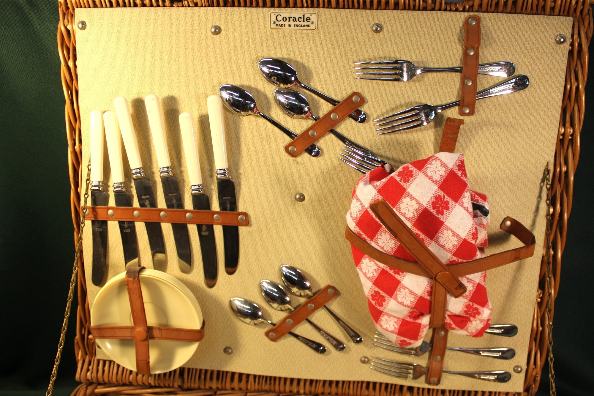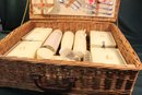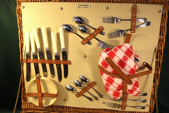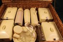 Antique Oak Coracle Picnic Basket, Set Of 6, 48 Pieces, Missing Outside Straps, 22x19x7 (17)