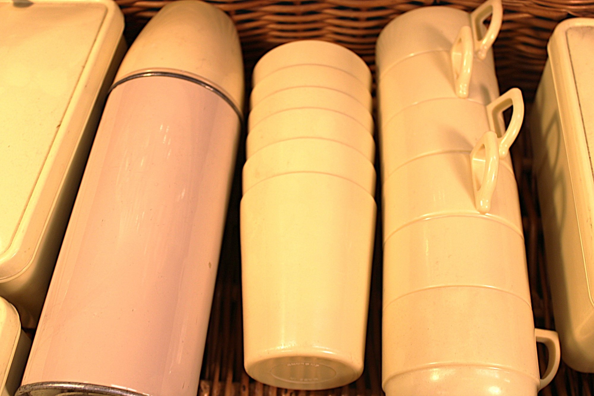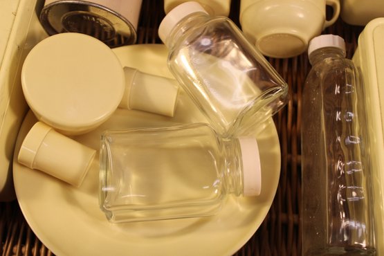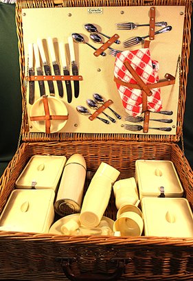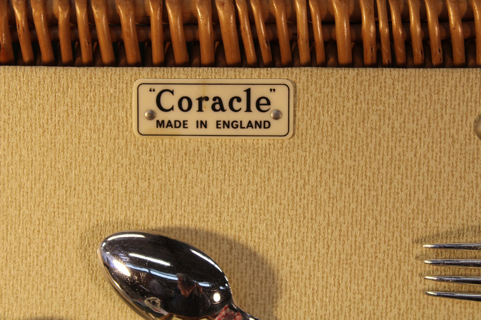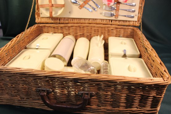 Antique Oak Coracle Picnic Basket, Set Of 6, 48 Pieces, Missing Outside Straps, 22x19x7 (17)