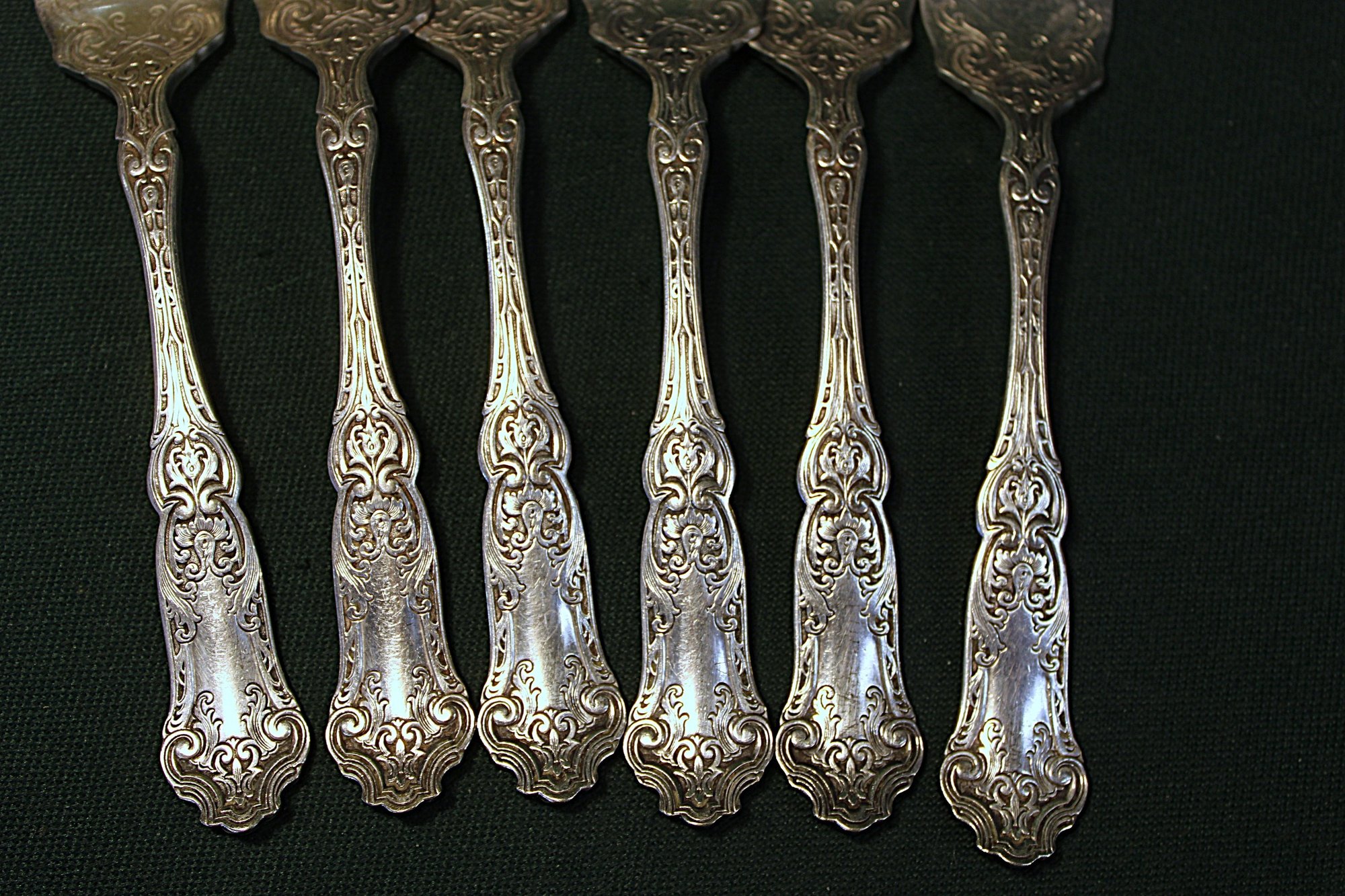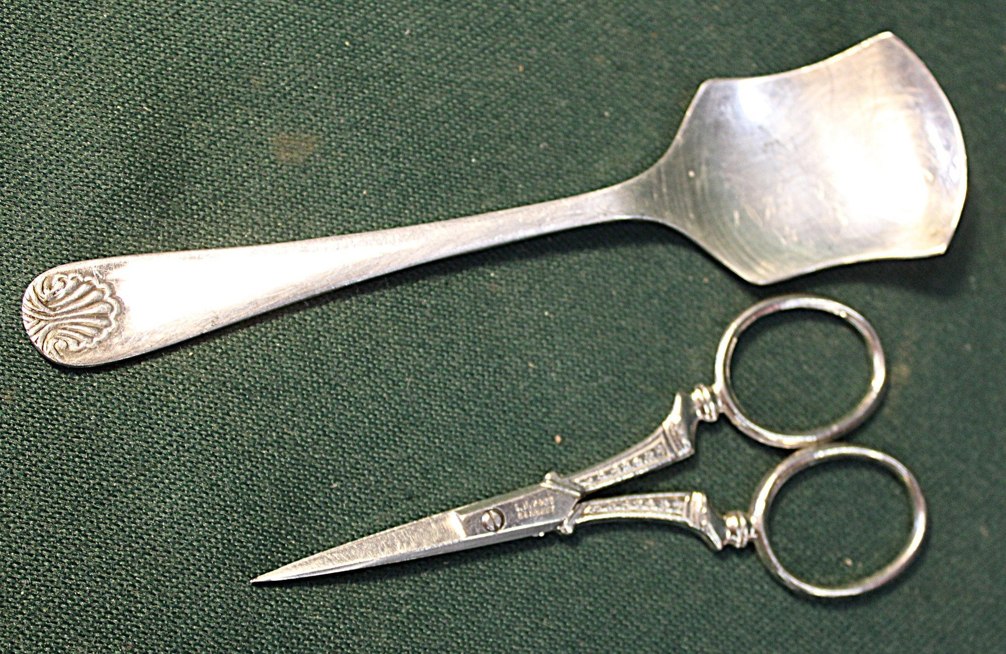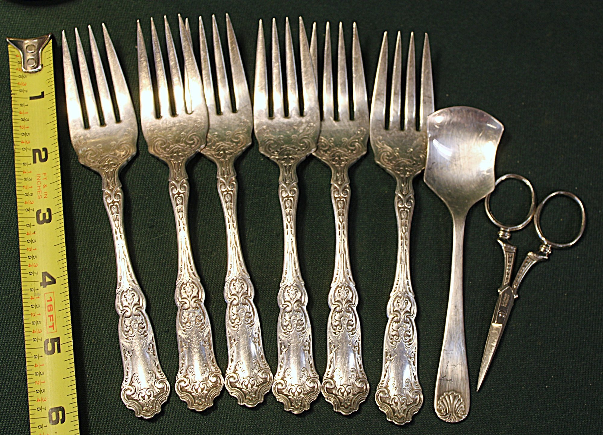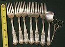 Antique Silver Plate 6 Wallace Pat. 07 Forks, English Spoon & German Scissors (7)