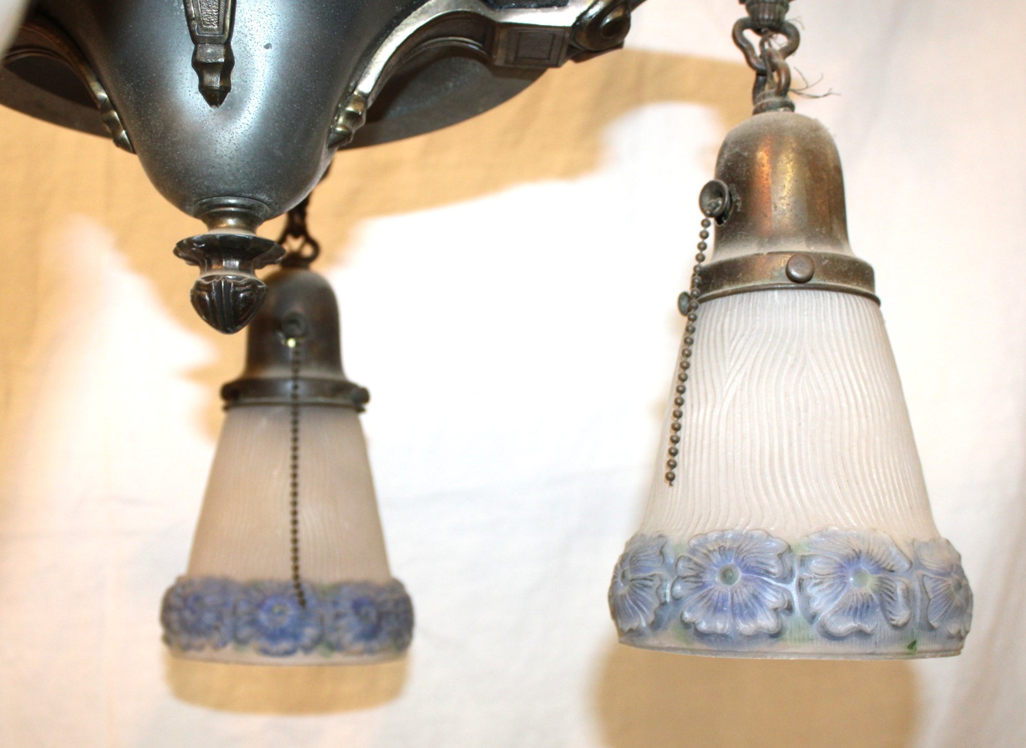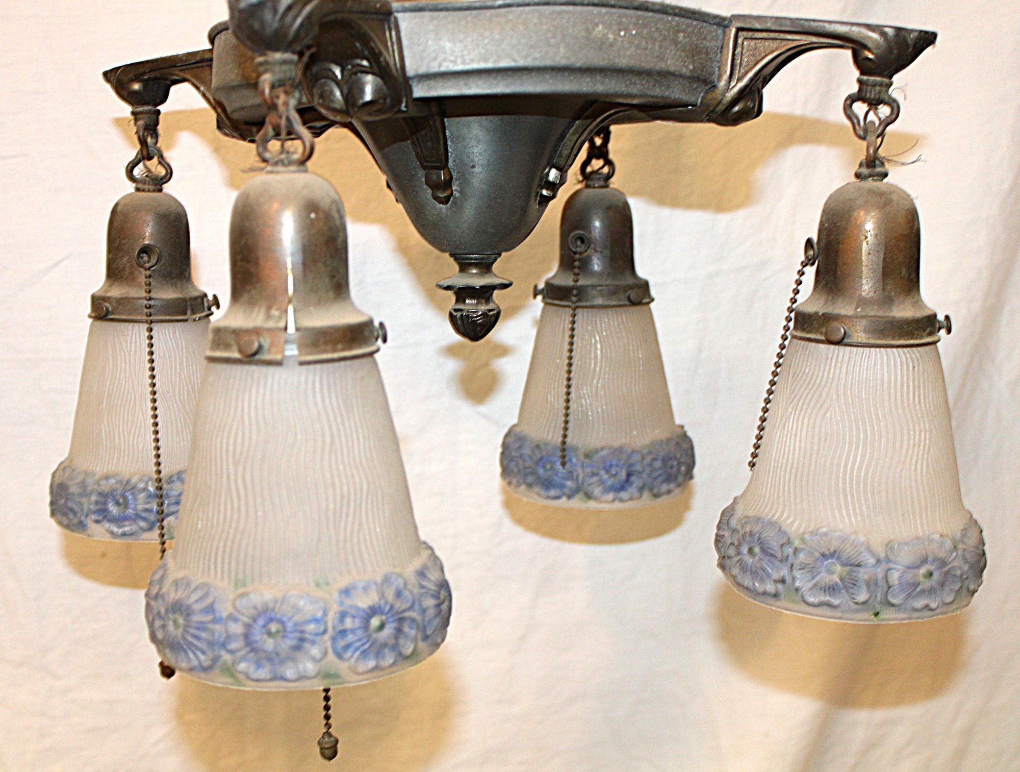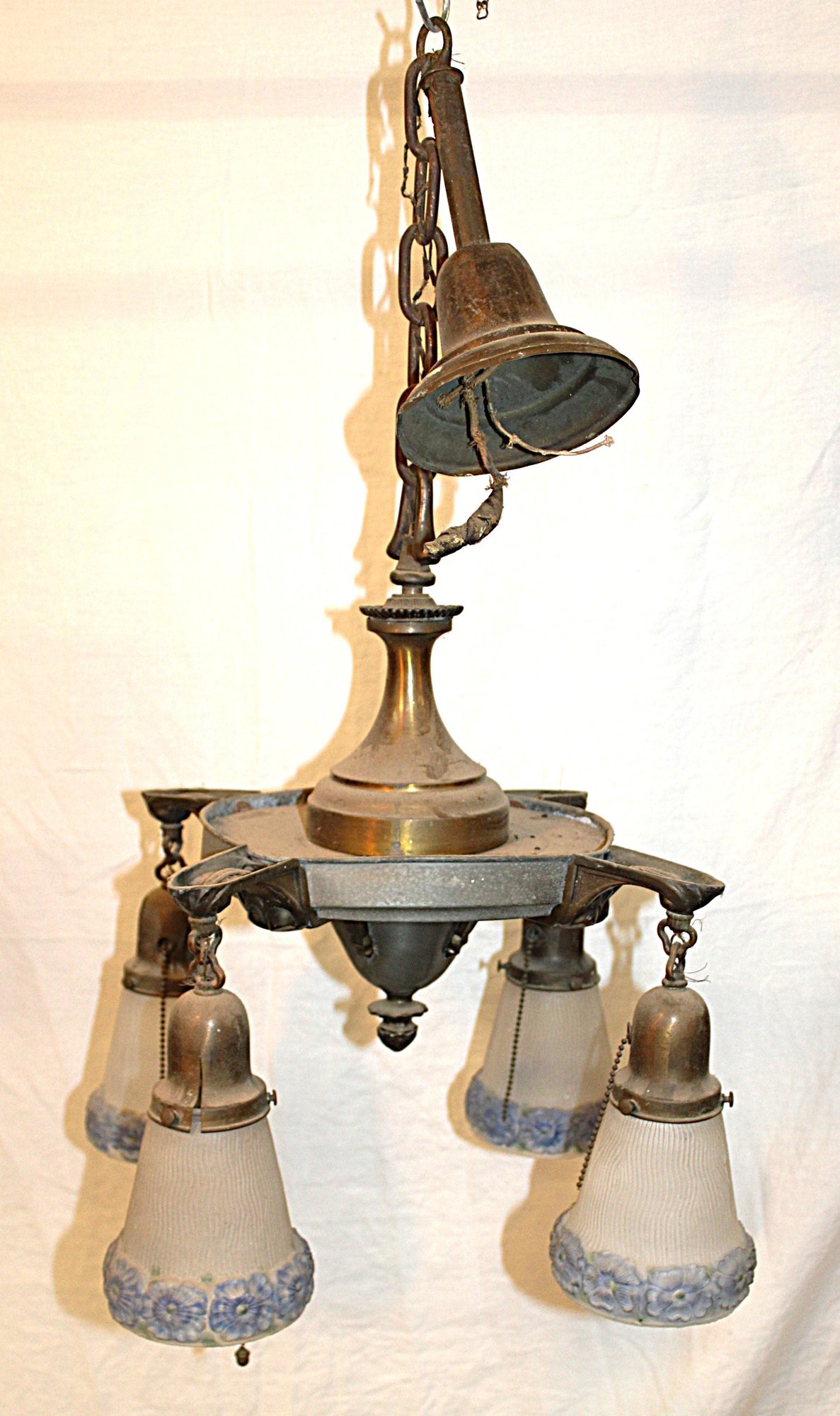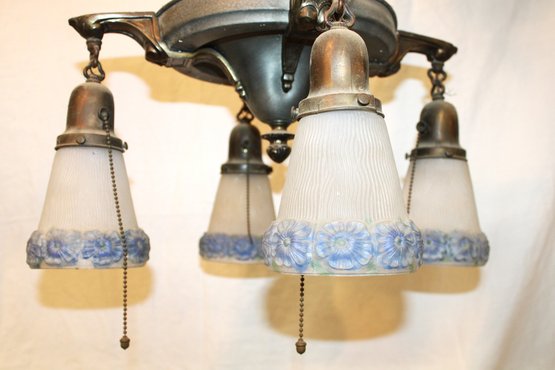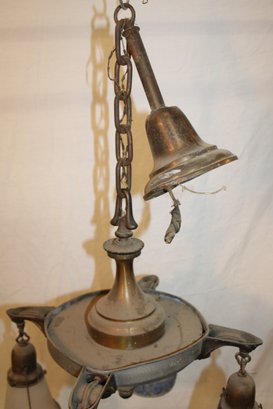 Antique Victorian 4 Light Brass "Pan" Chandelier & 4 Glass Shades, Rewiring Required (282)