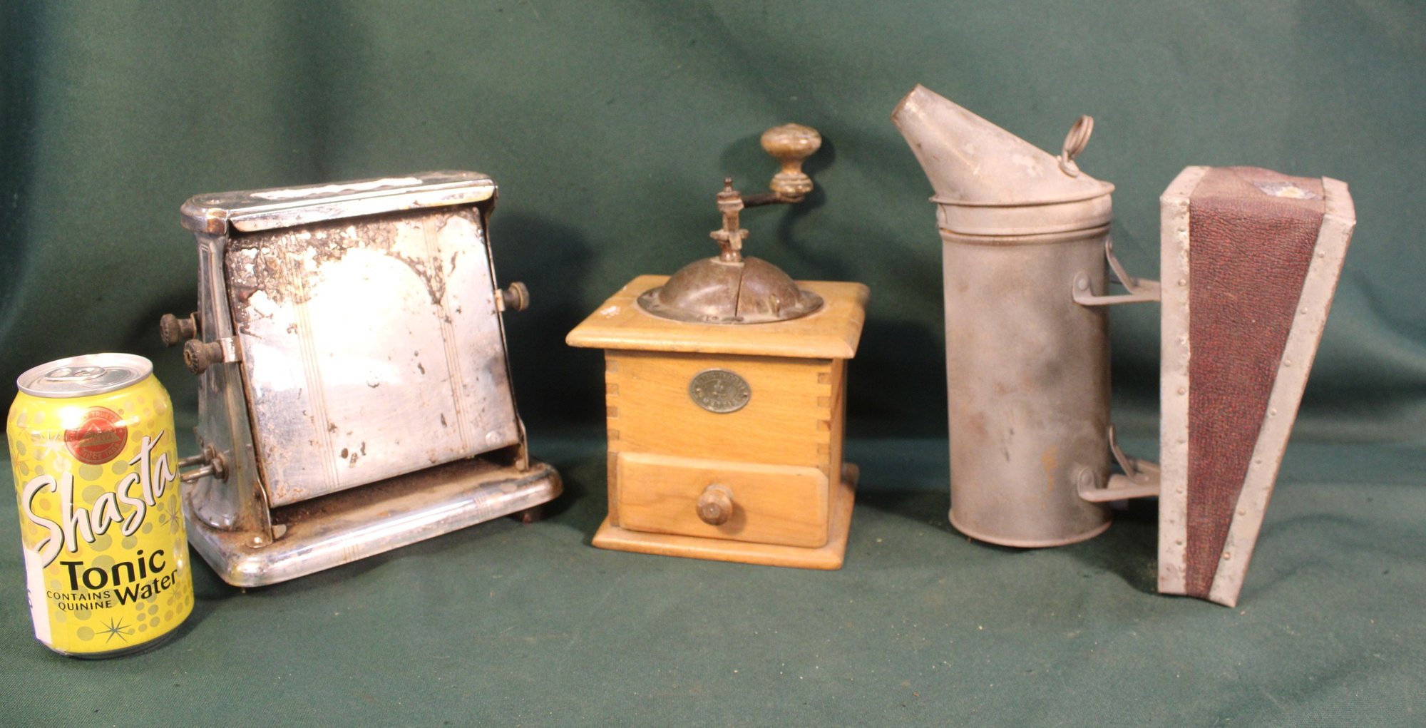 Antique Wood Coffee Grinder, Bee Smoker & Universal Toaster W/no Cord (356)