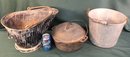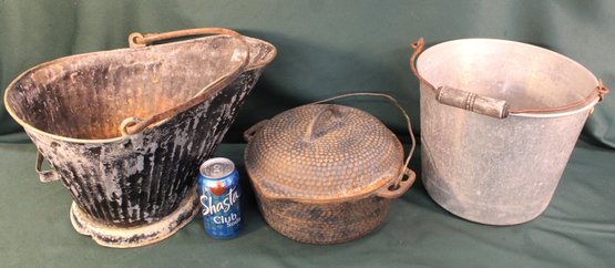 Cast Iron Lidded Dutch Over W/hole In Bottom, Coal Bucket & Pail (221)