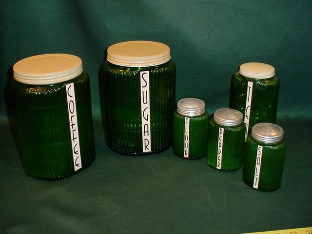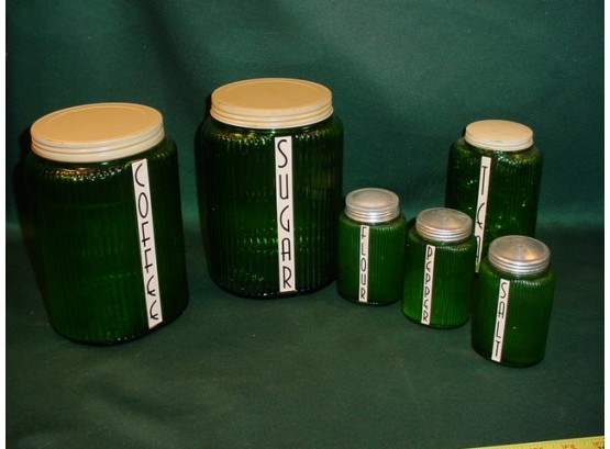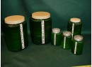 Depression Era 6 Piece Green Glass Labeled Canister Set (1)