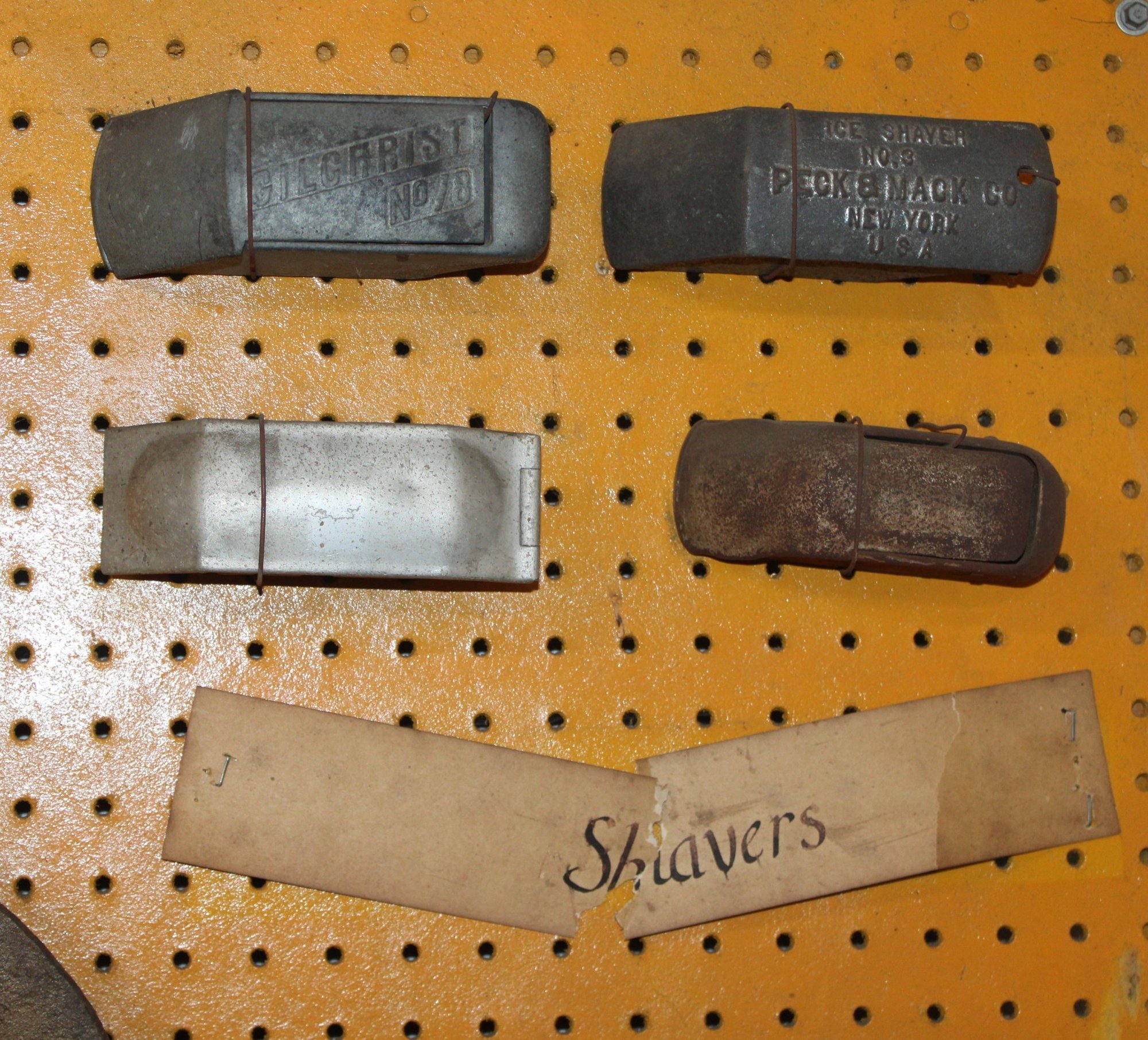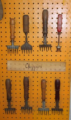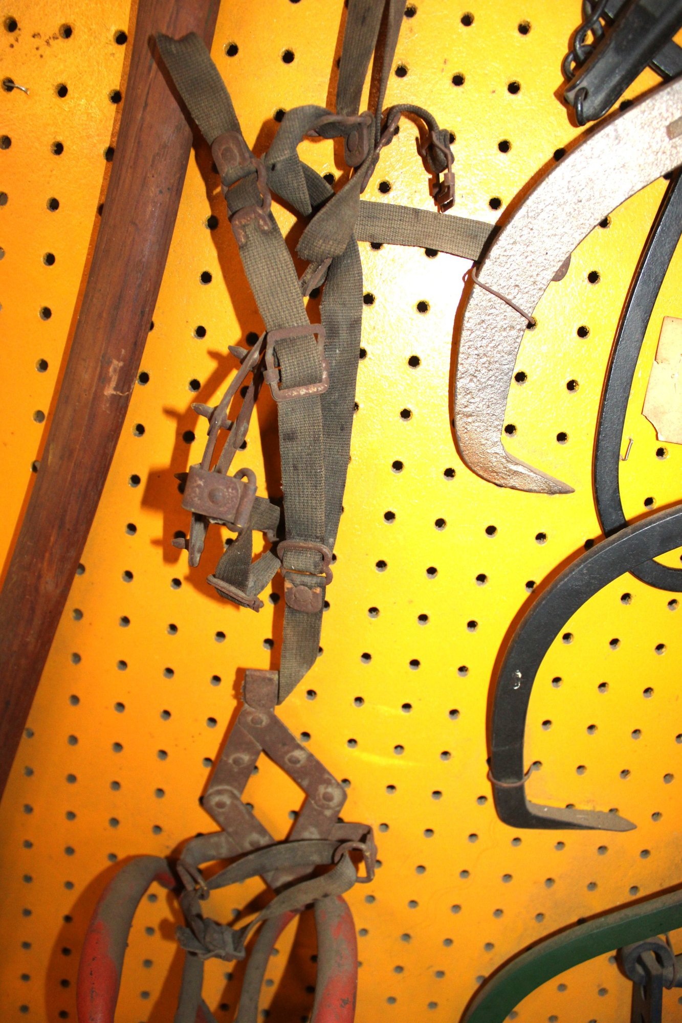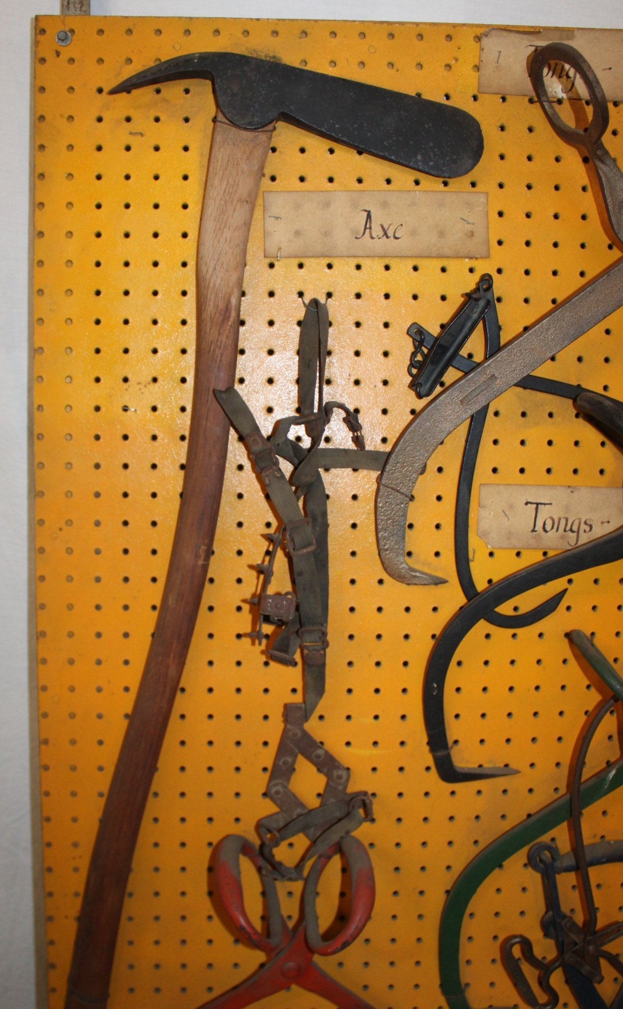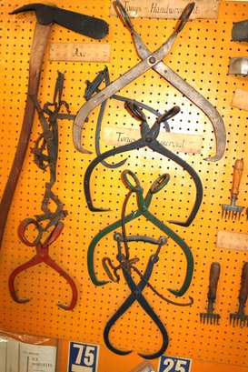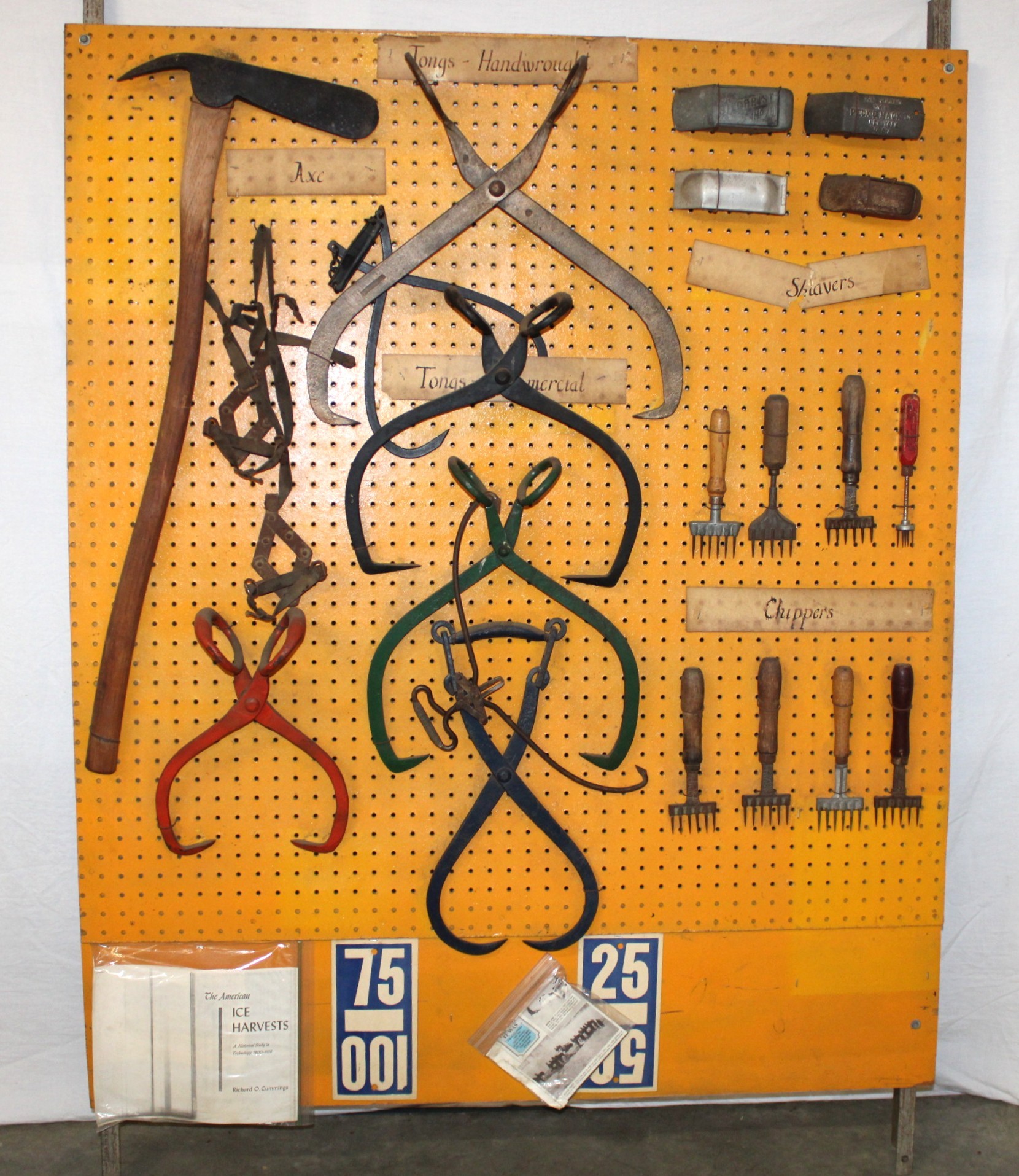 Display Of Antique Iron Ice Harvesting Tools - Cramp Ons, Shavers, Chippers, Tongs, Axe, 46x55 Board (98)