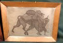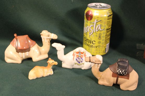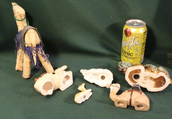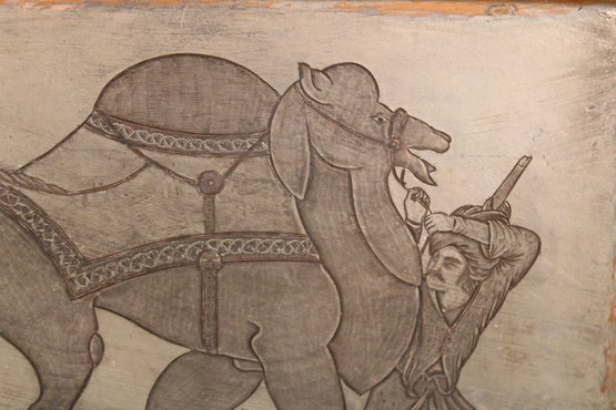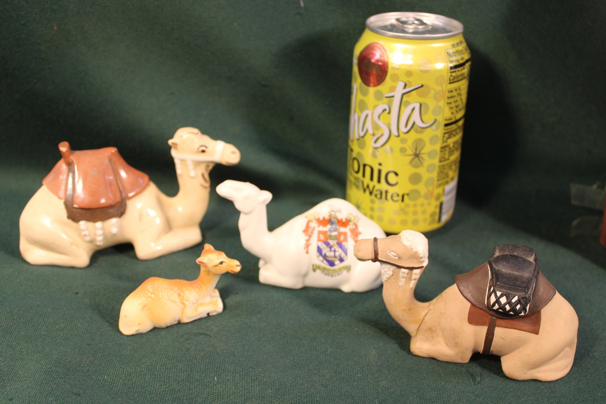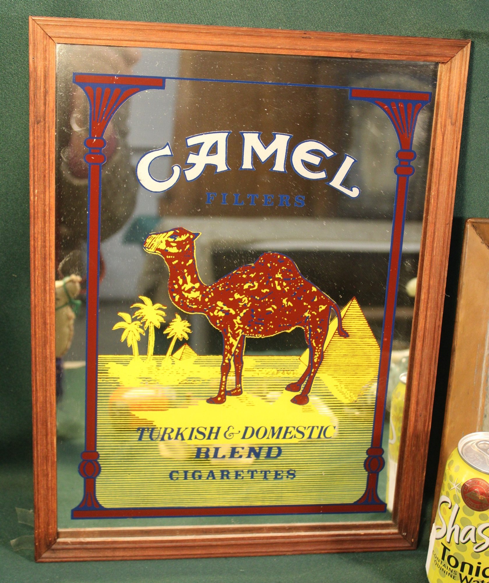 Framed Camel Cig Mirrored Ad (12x16"), Framed Engraved Copper Tray (14x10.5") & 6 Camel Figurines (175)