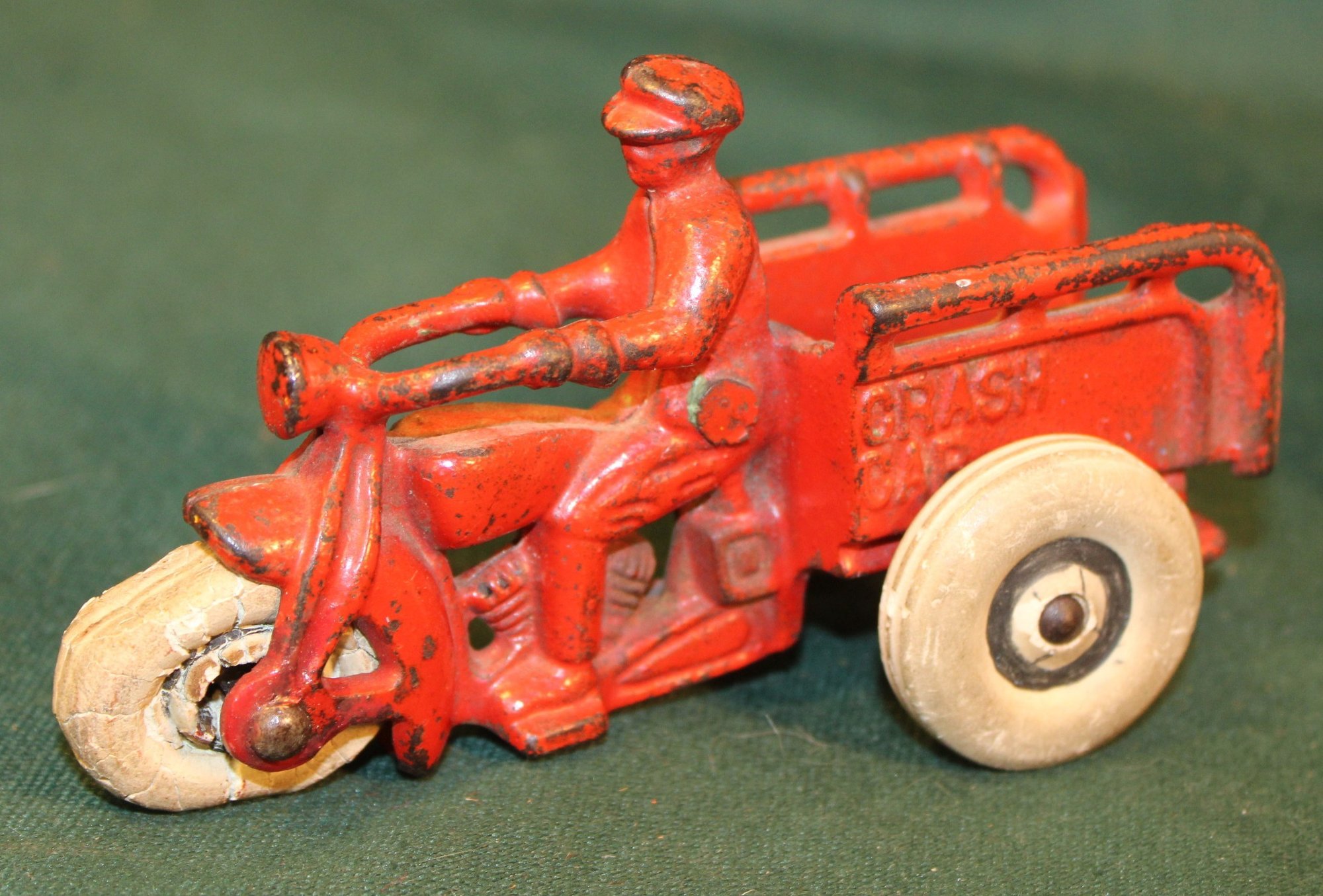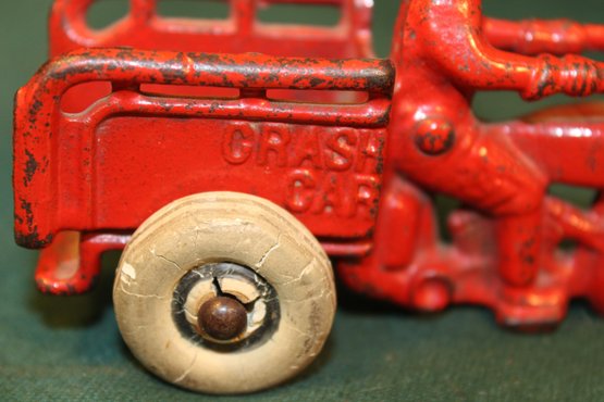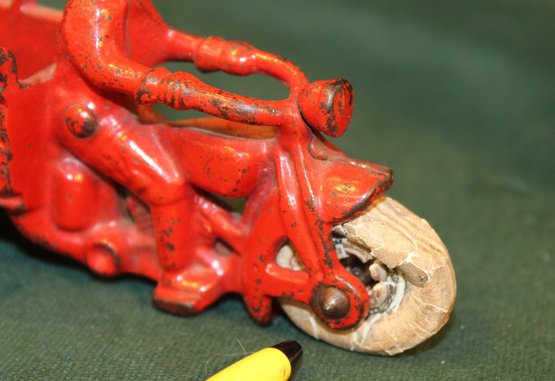 Hurley "Crash Car" Toy Cast Iron Motorcycle, 1930s, 5x2x3. (7)