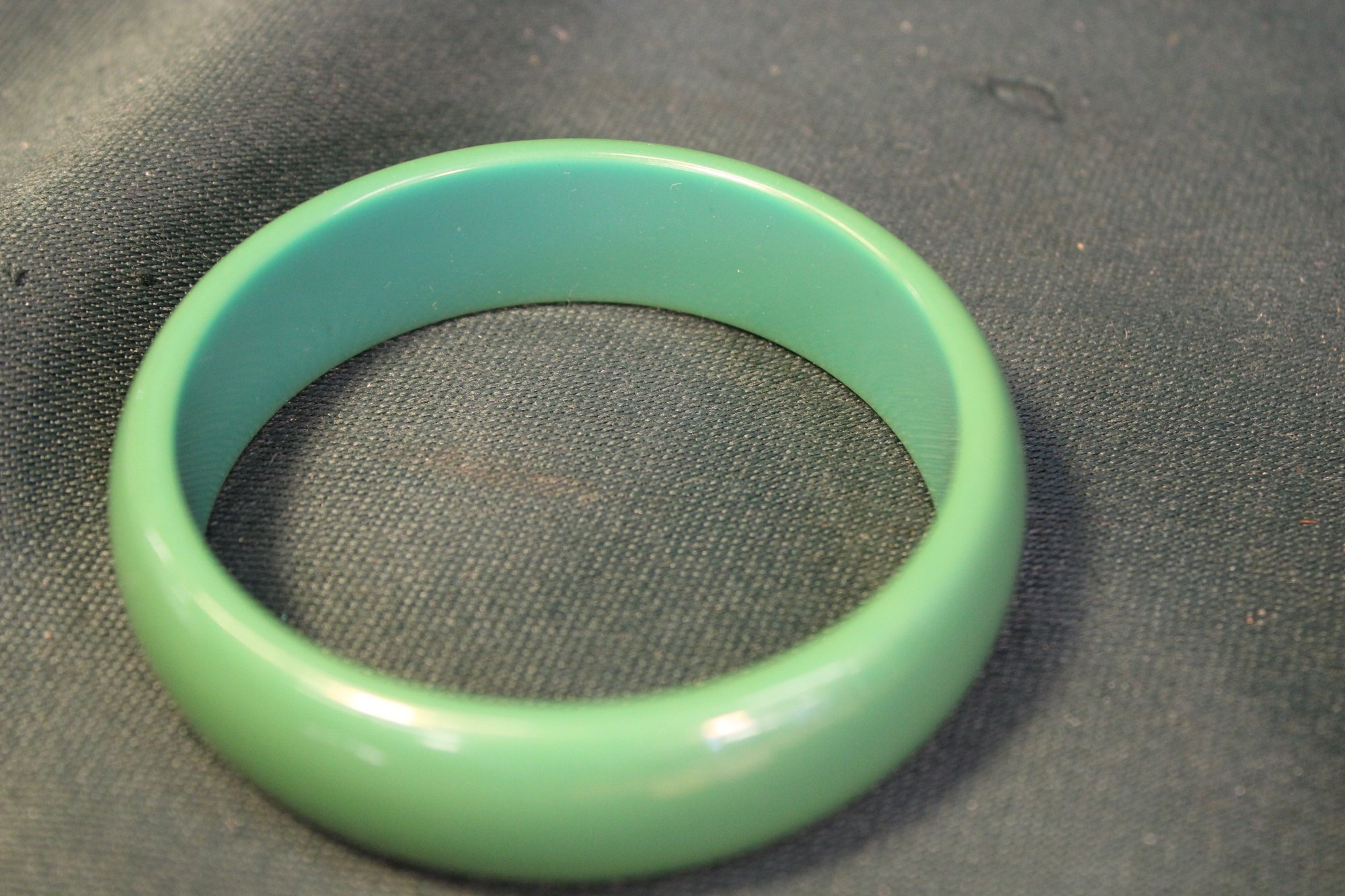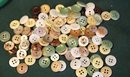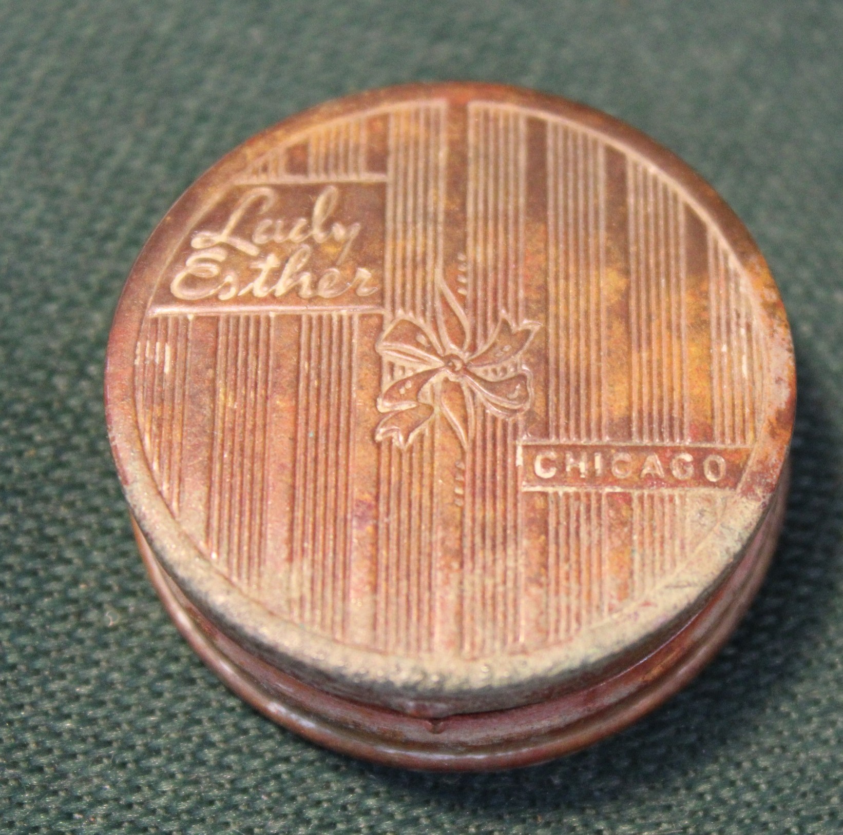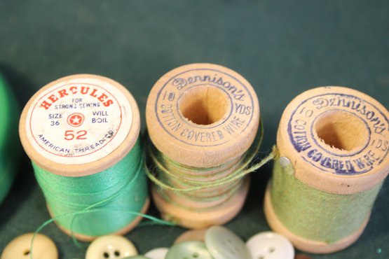 Lady Ester Tin, 3 Wood Thread Spools, Buttons, (Bakelite?) Bracelet (137)