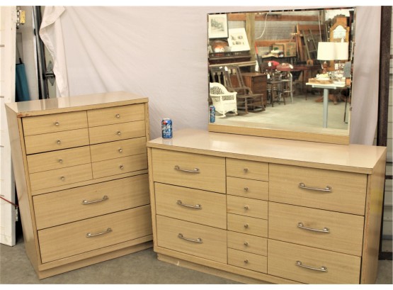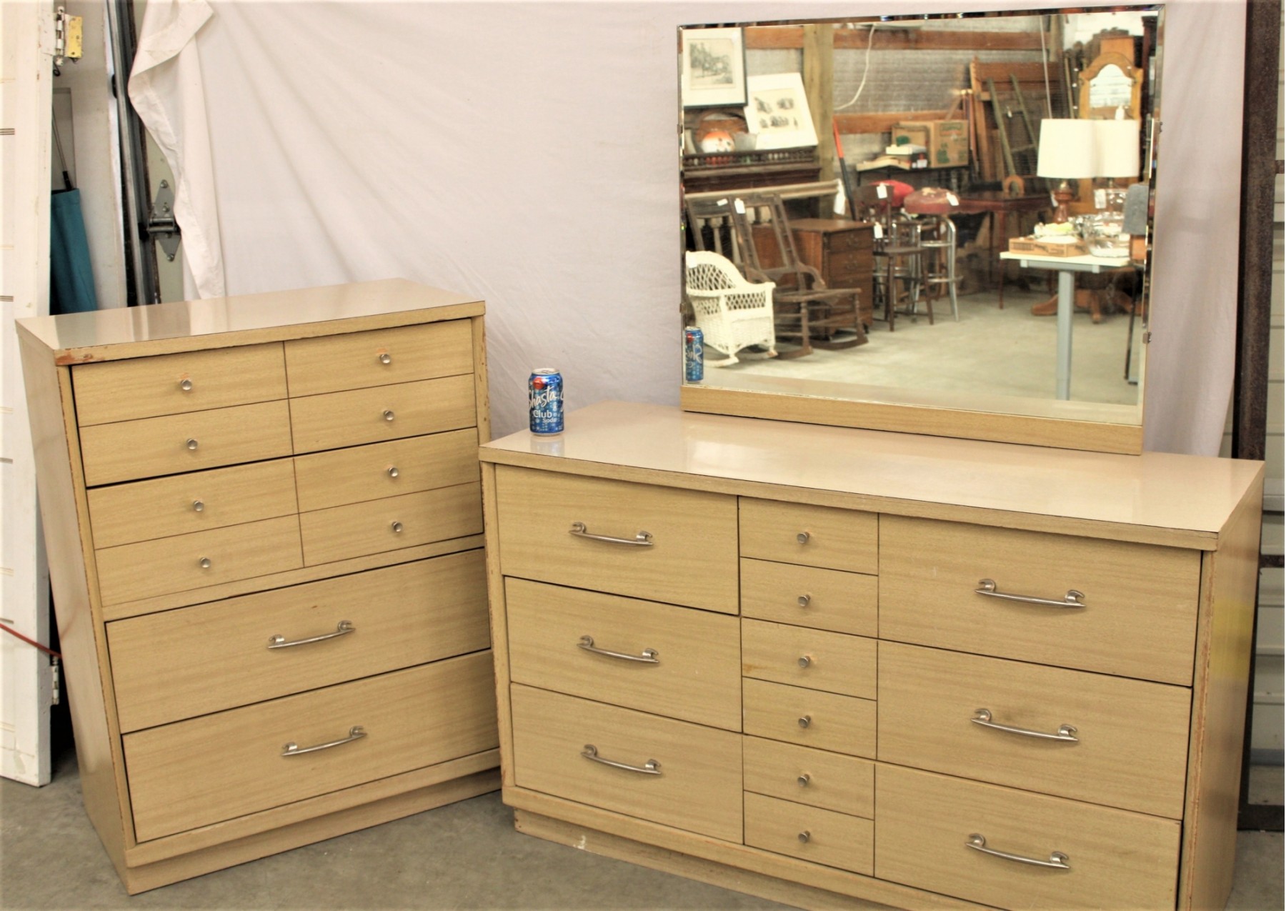 4 drawer hi dresser/chest 32"x 18"x 42" and 6 drawer low dresser (53"x 18"x 32") with mirror (36"x 30"H). Some wear on hi chest as shown.