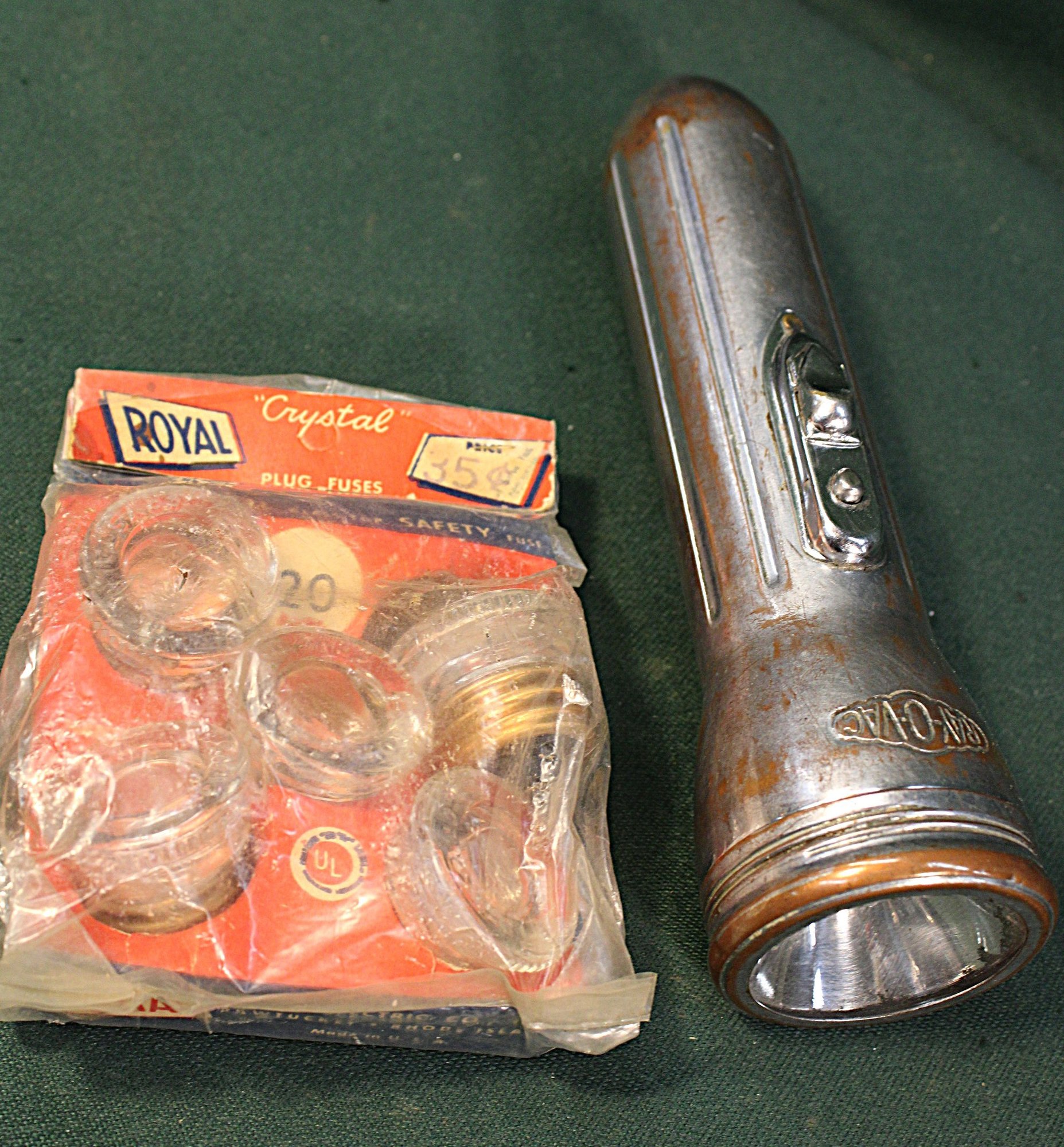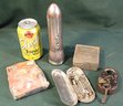 Mint Tin, Ray-O-Vac Flashlight(working), Royal Fuses, Cutter Lab Field Hypodermic Needle, Lock W/Keys (264)