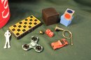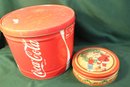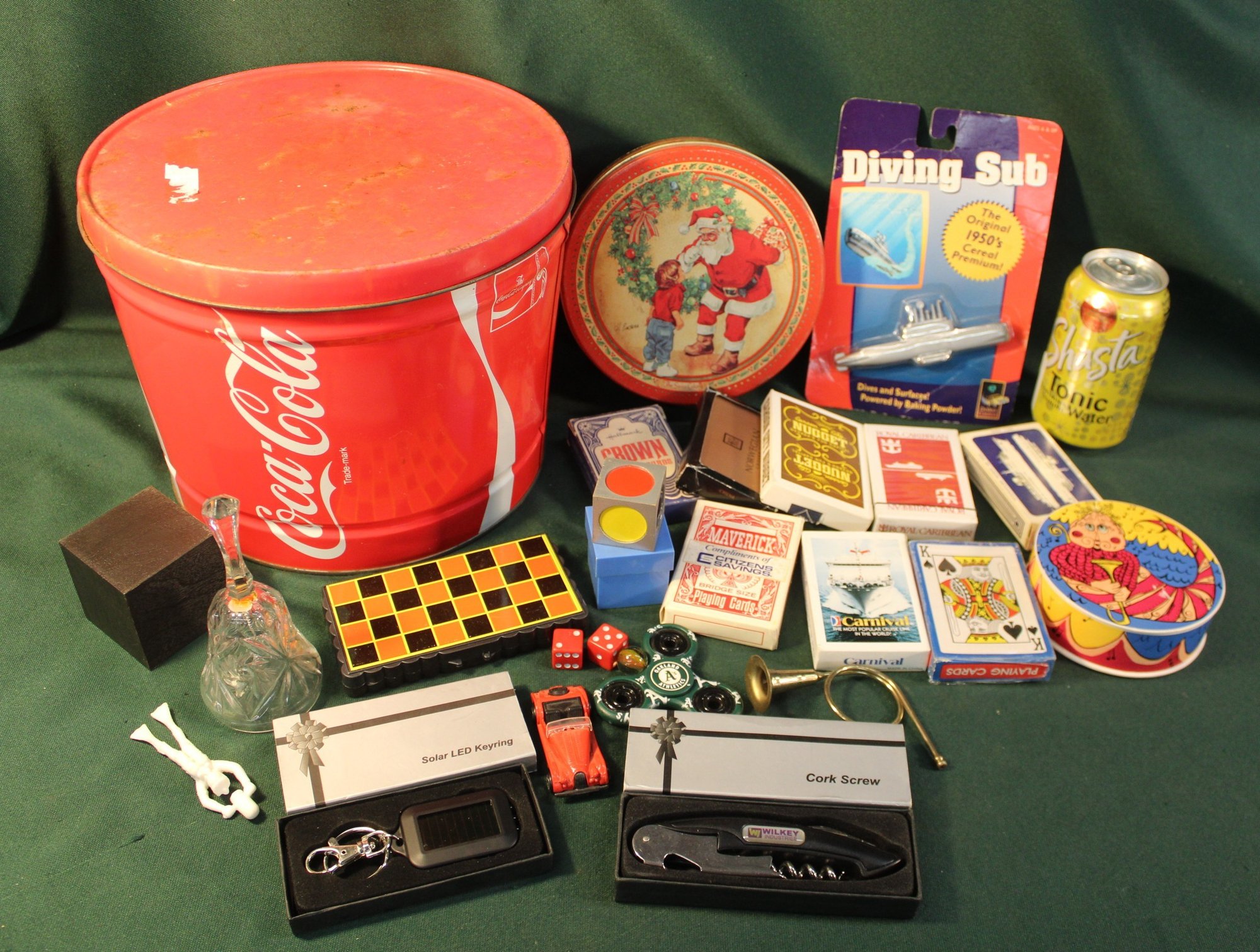 Misc. Lot In Vintage Coca Cola Tin - Playing Cards, Puzzle, Toys Bell, More (385)