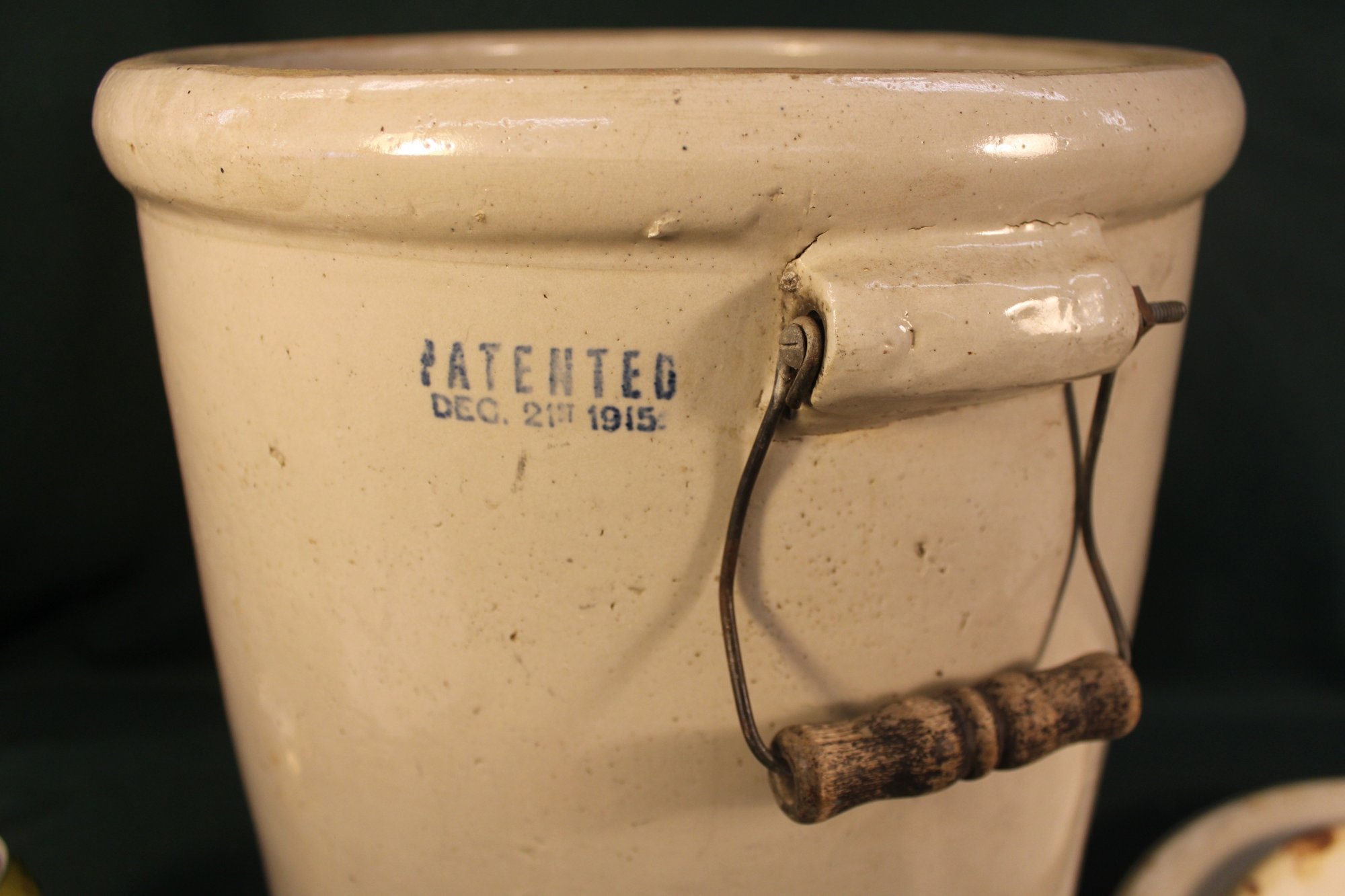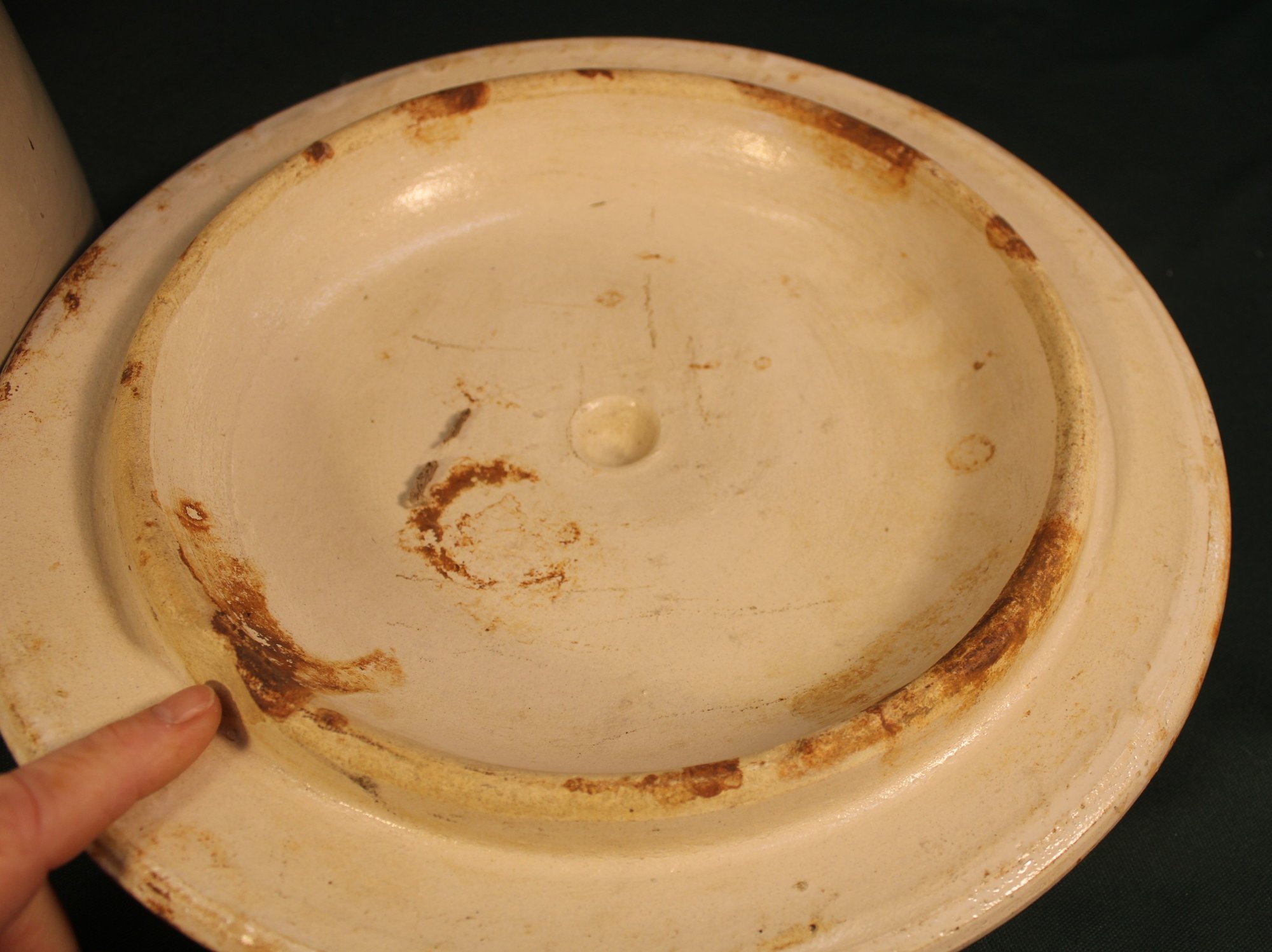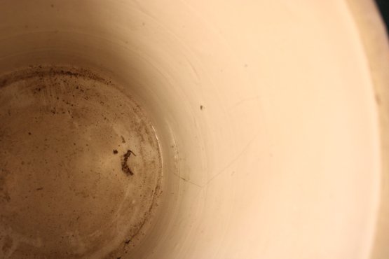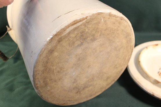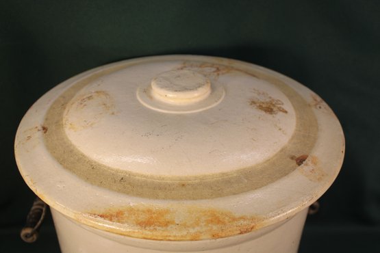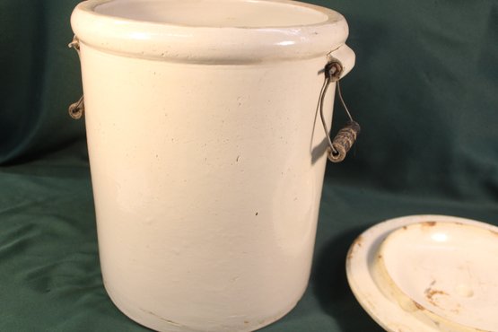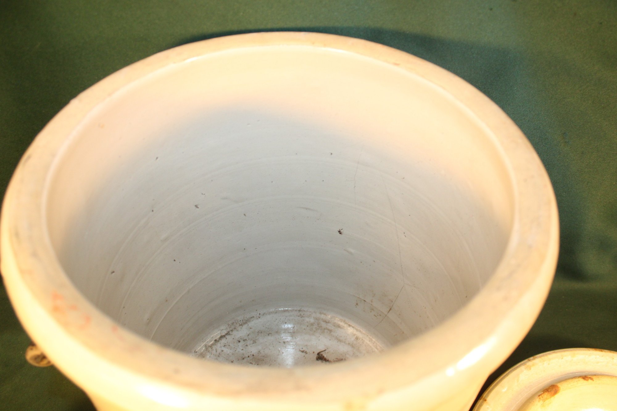 Lid has chip as shown and inside of crock has hairline, but not on outside.