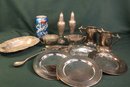 Silver Plate Salt & Pepper, 6 @ 6" Plates, 2 Sugar & Creamers, Tray, More (316)