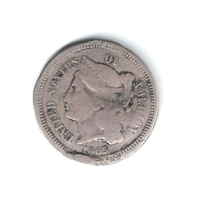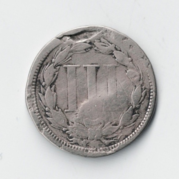 Presented for auction is this damaged 1865 three Cent Nickel. In addition to the damage in the pictures there is a bend.