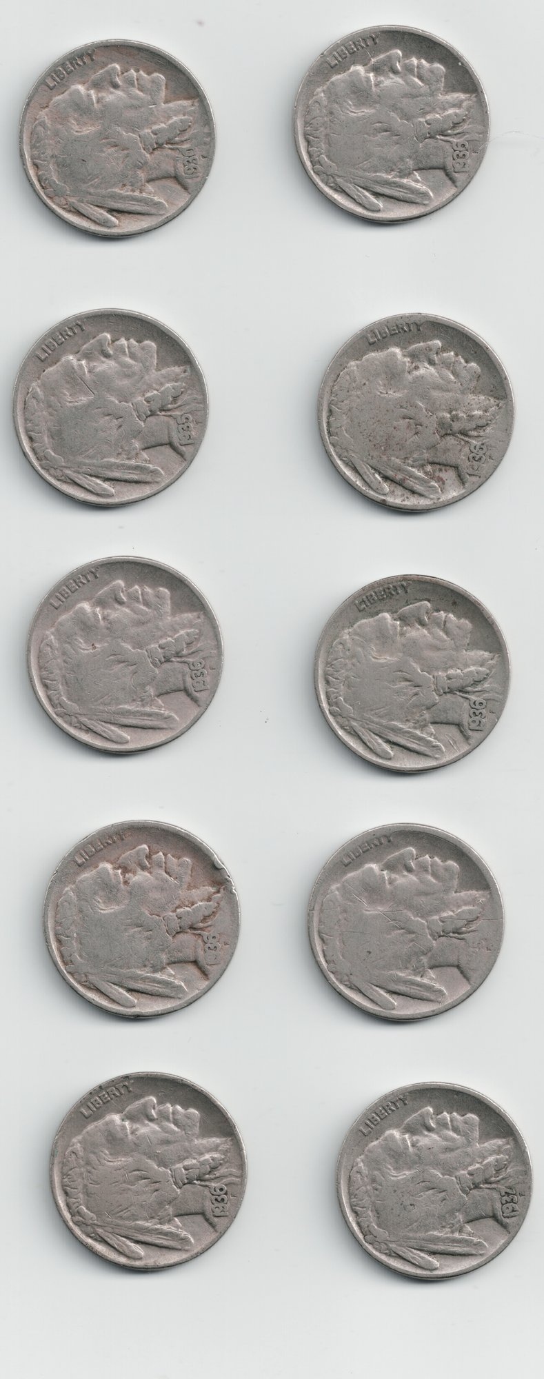 Presented for auction is this Lot of 10 Dated Buffalo Nickels 5 Cent Pieces Dates 1925, 1930, 1935, 1936, 1937