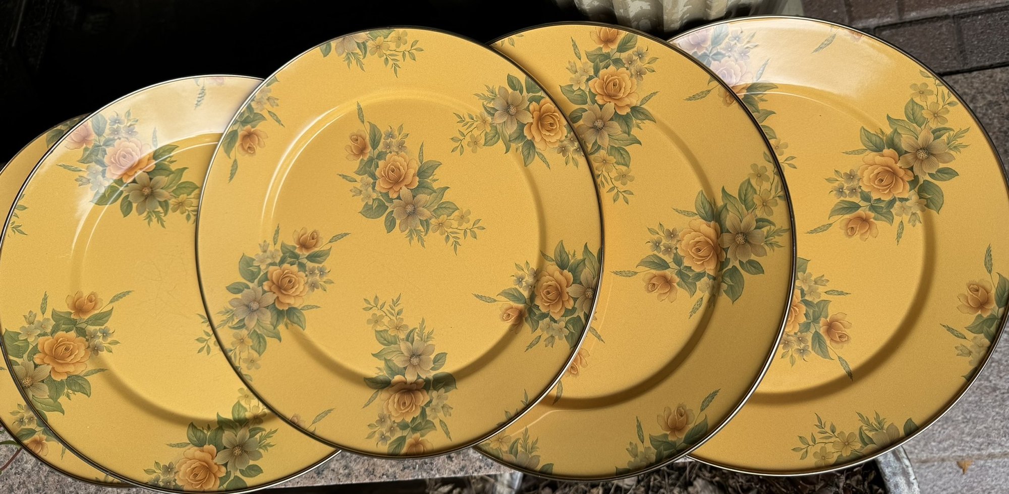 5 Mackenzie Childs dinner plates - enameled. Diameter is approx 12 inches.