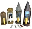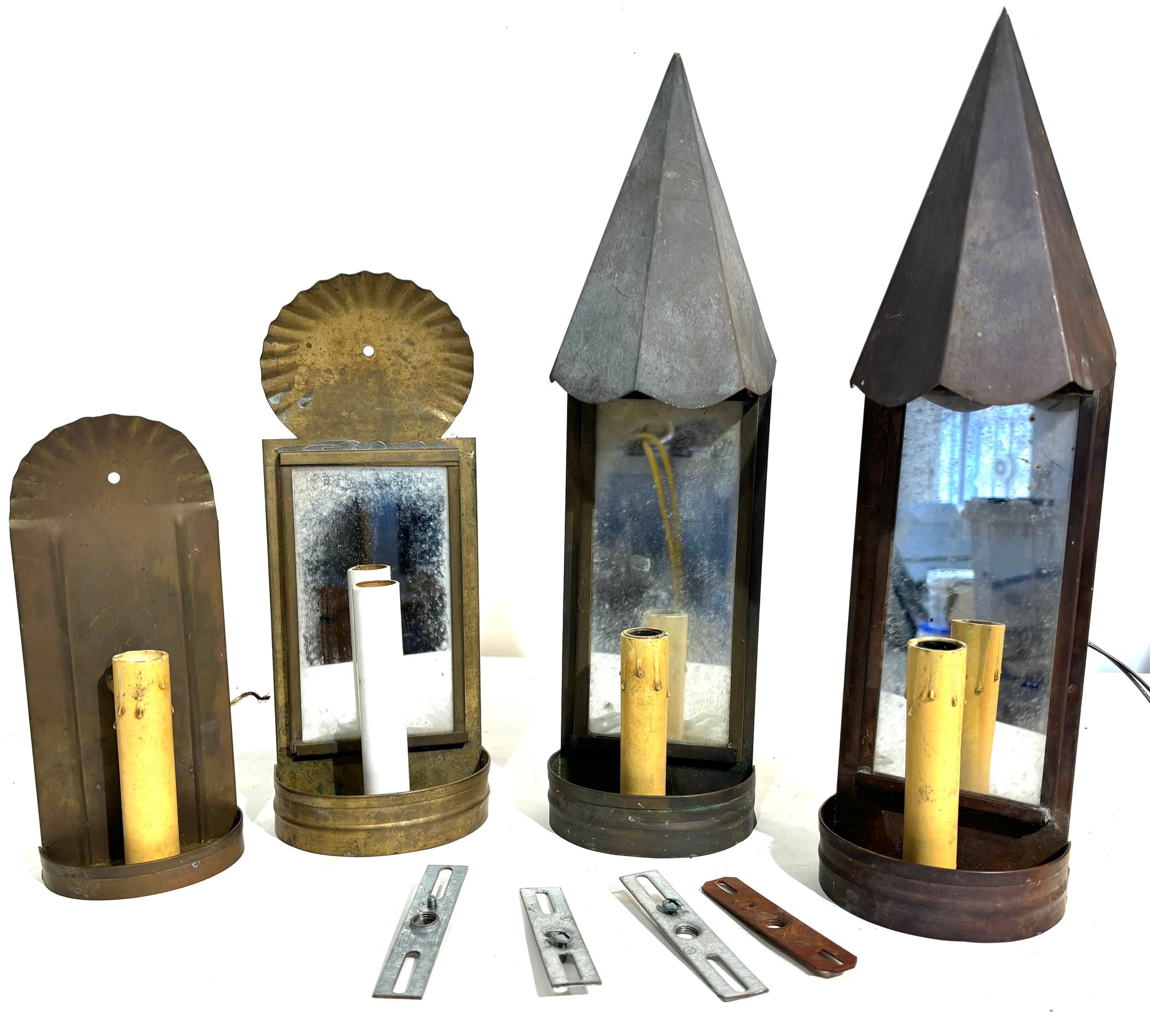 Solid brass and copper sconces. Reproductions(Need to be rewired)Various sizes between approx. 7" - 13" height.