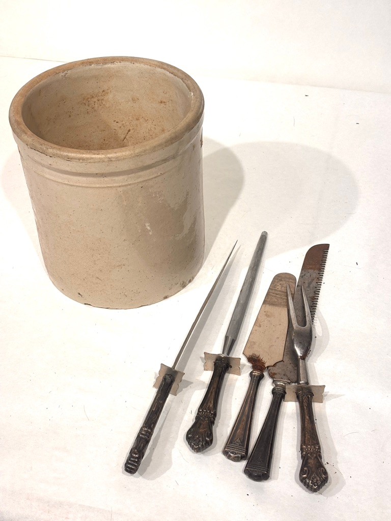 Vintage Stoneware Crock And Serving Utensils
