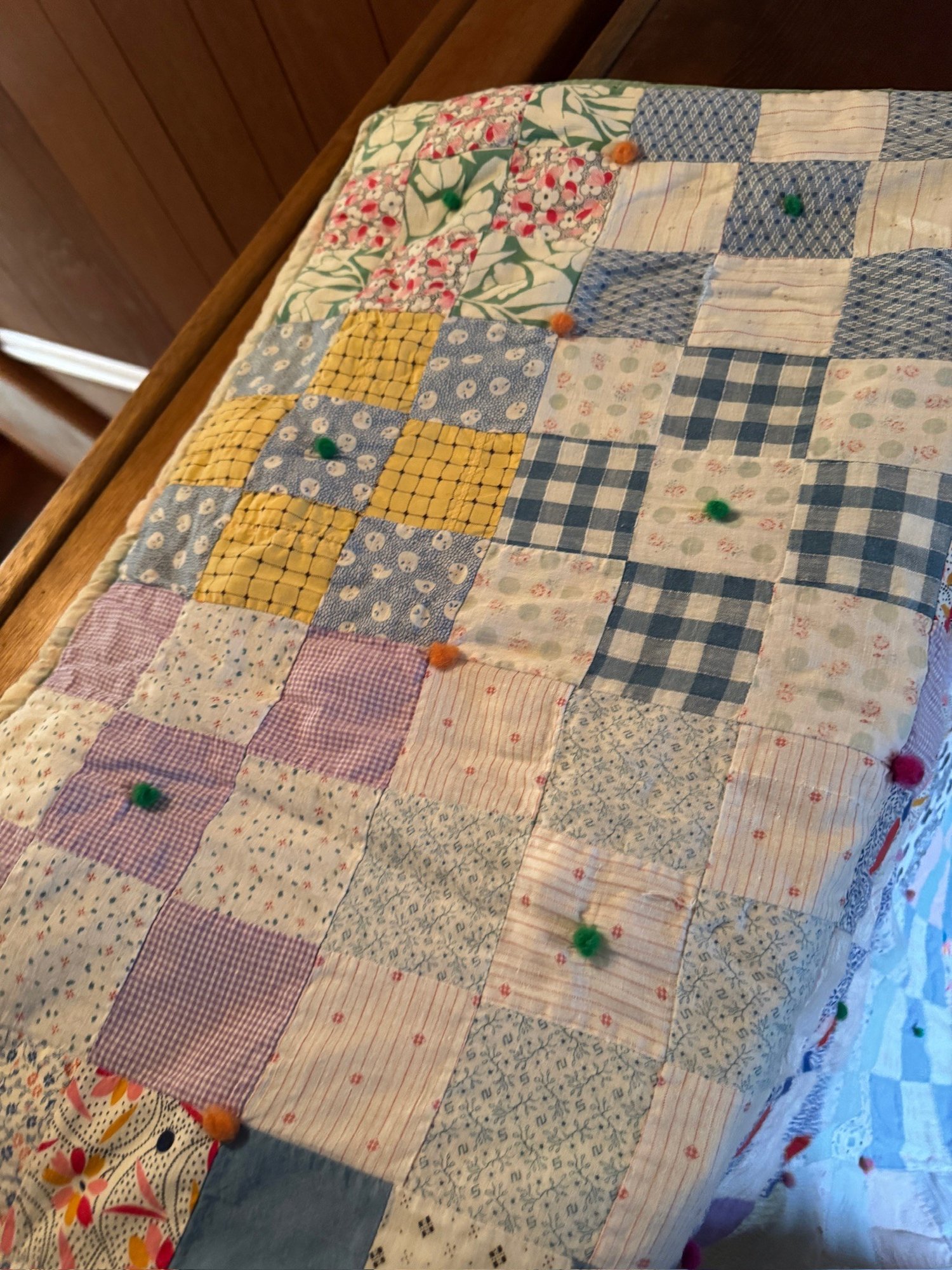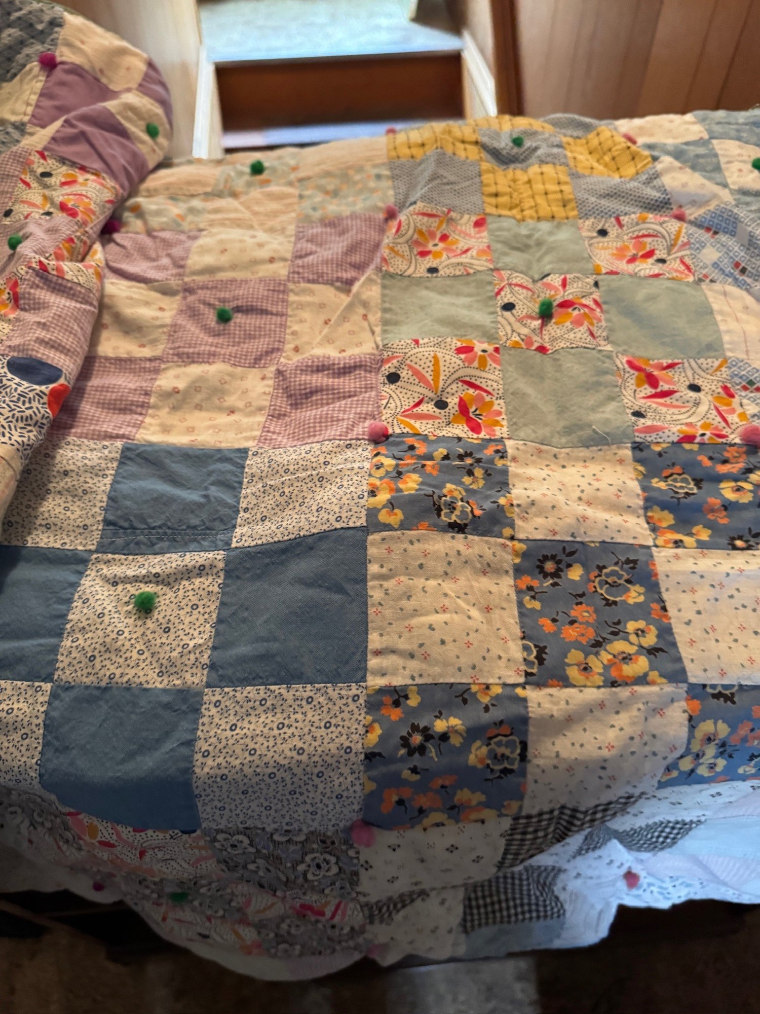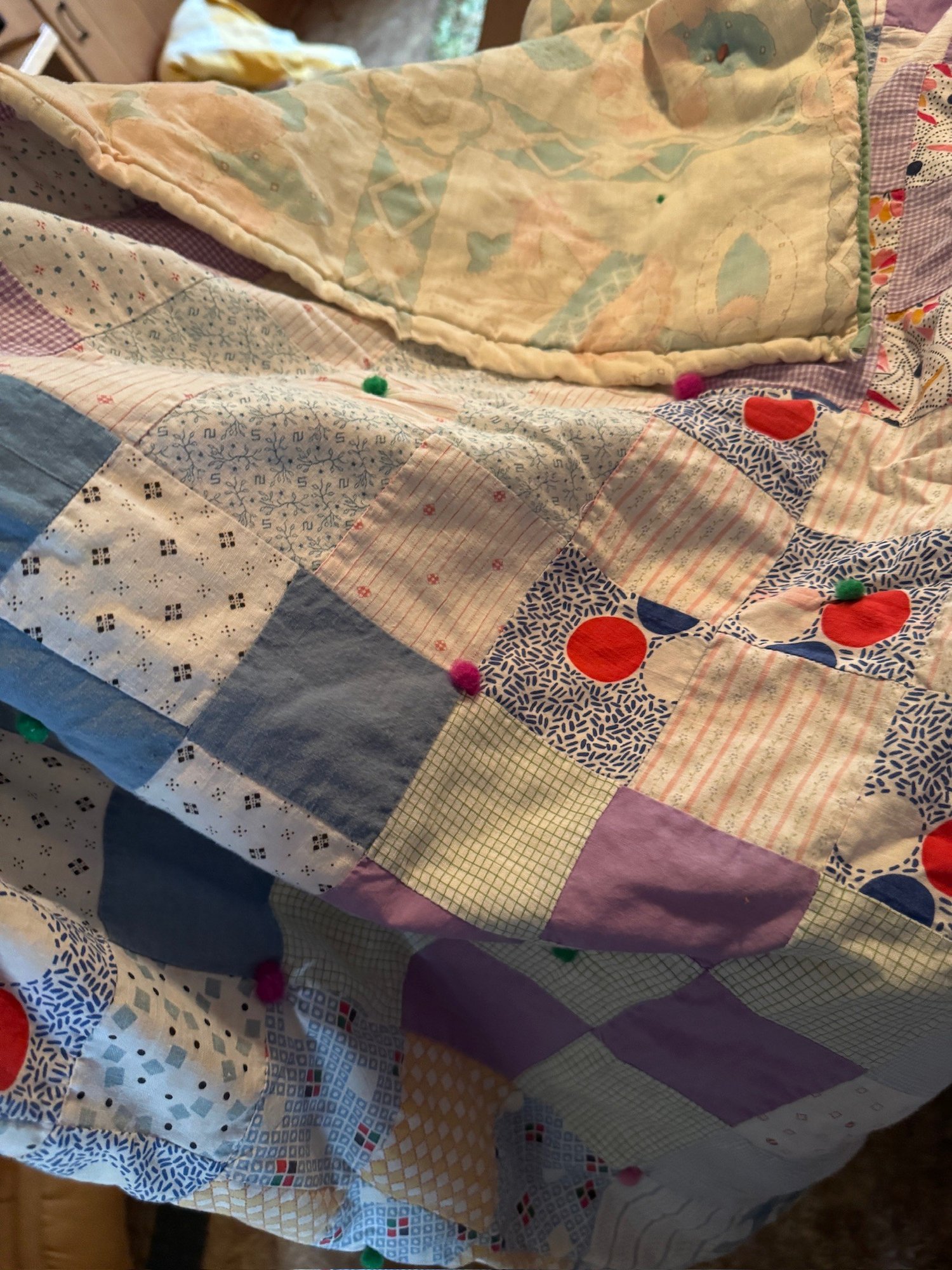 Please note that this beautiful vintage handmade quilt does have some balling to the inside lining of the quilt. Just noted for a complete accuracy, still warm cozy and perfect for your collection!