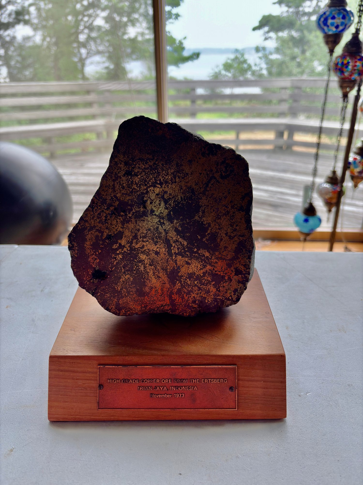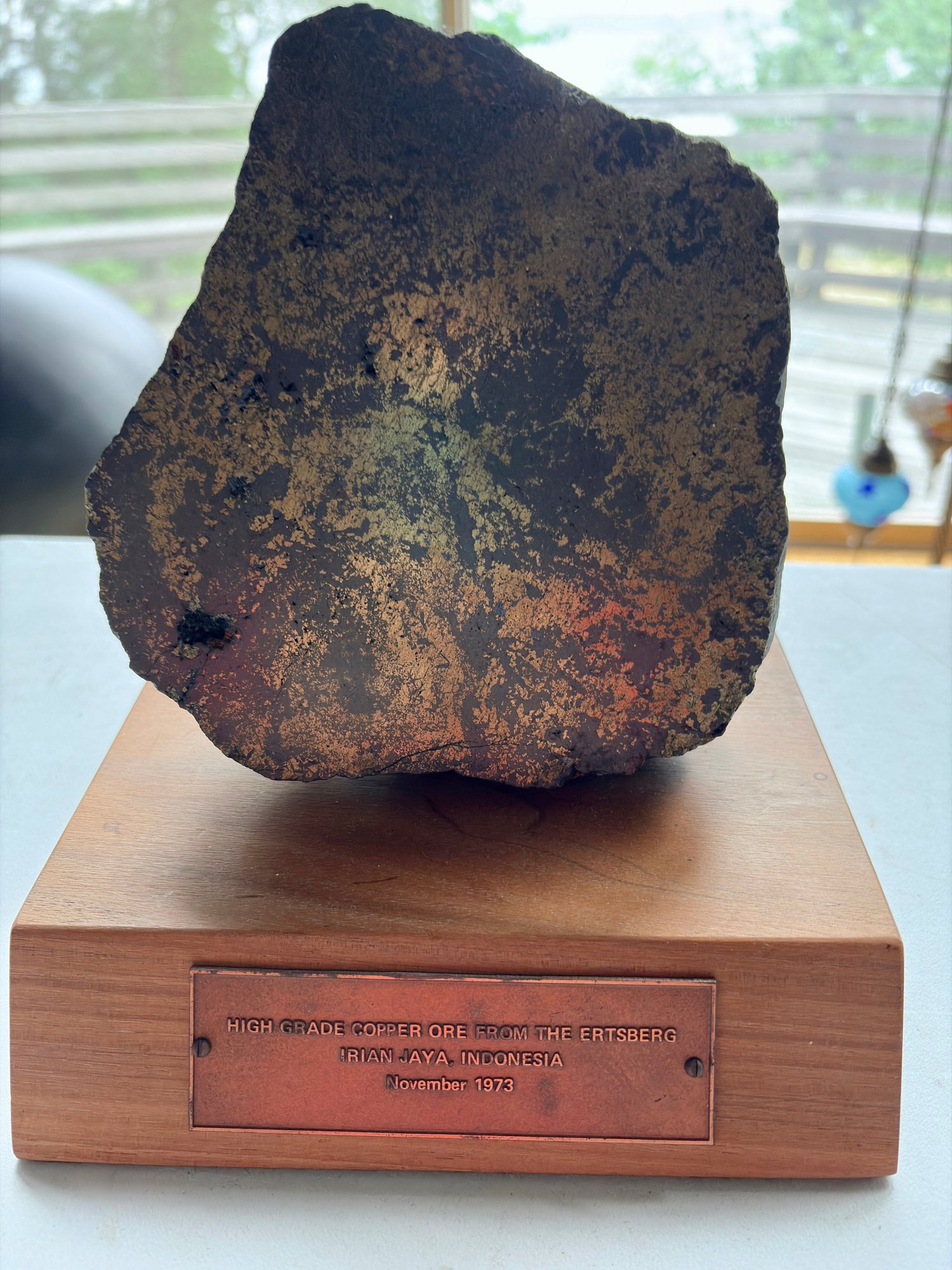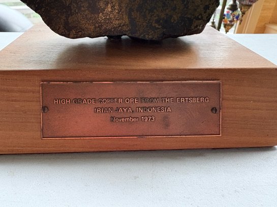 Plaque describes : High grade copper ore from the Ertsberg Irian Java Indonesia