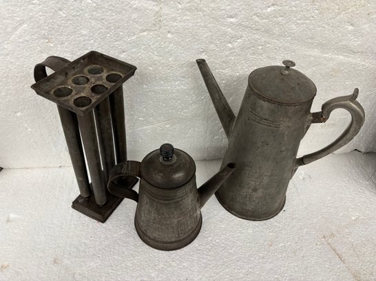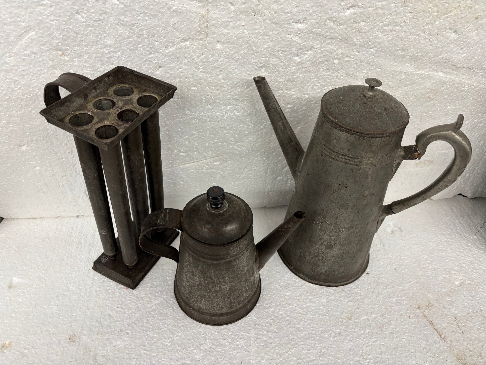 LOT OF 19TH C. TIN CANDLE MOLD W/2 POTS