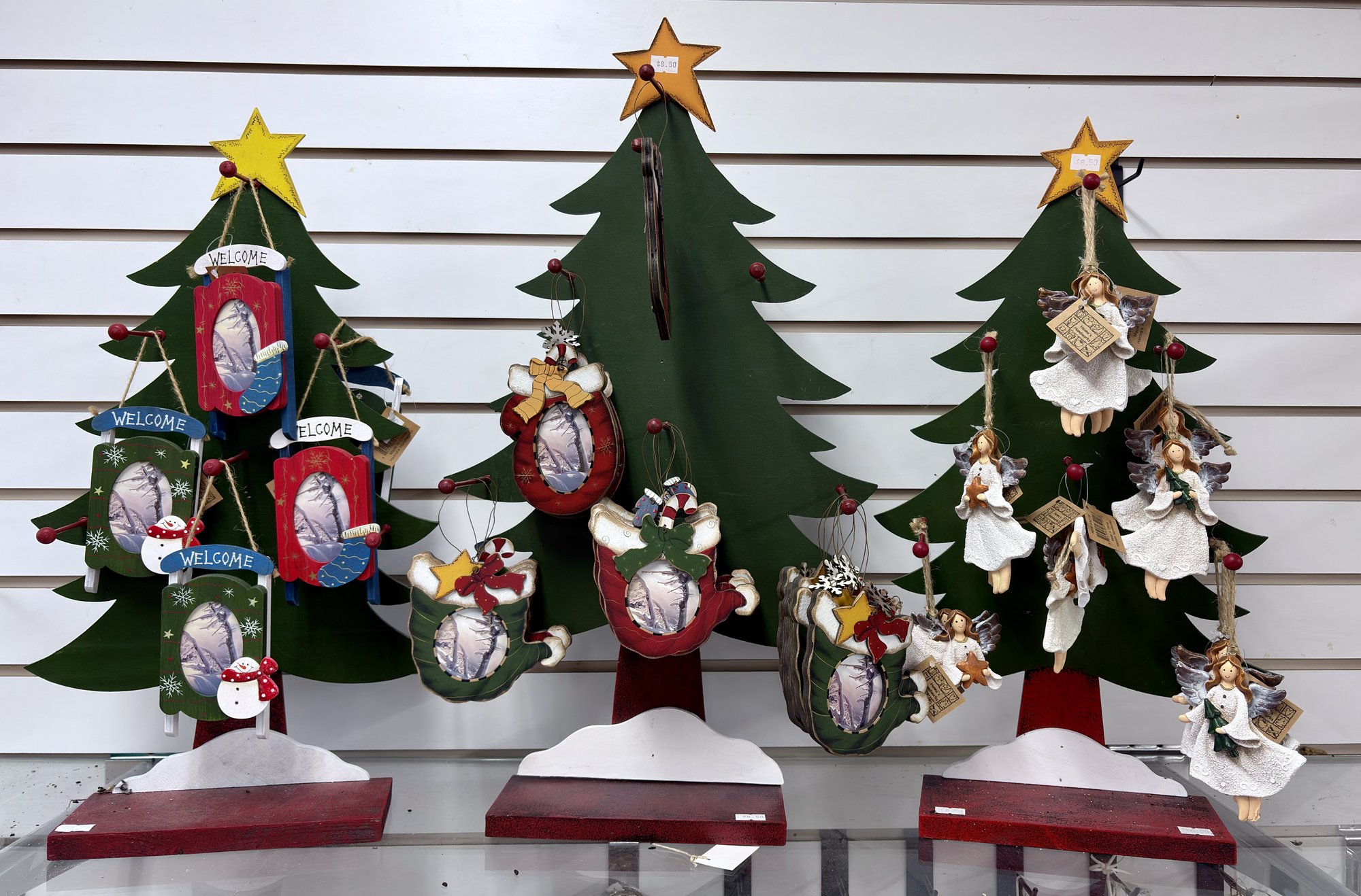 Three Christmas Tree Shelf Displays With Picture Frame And Other Ornaments