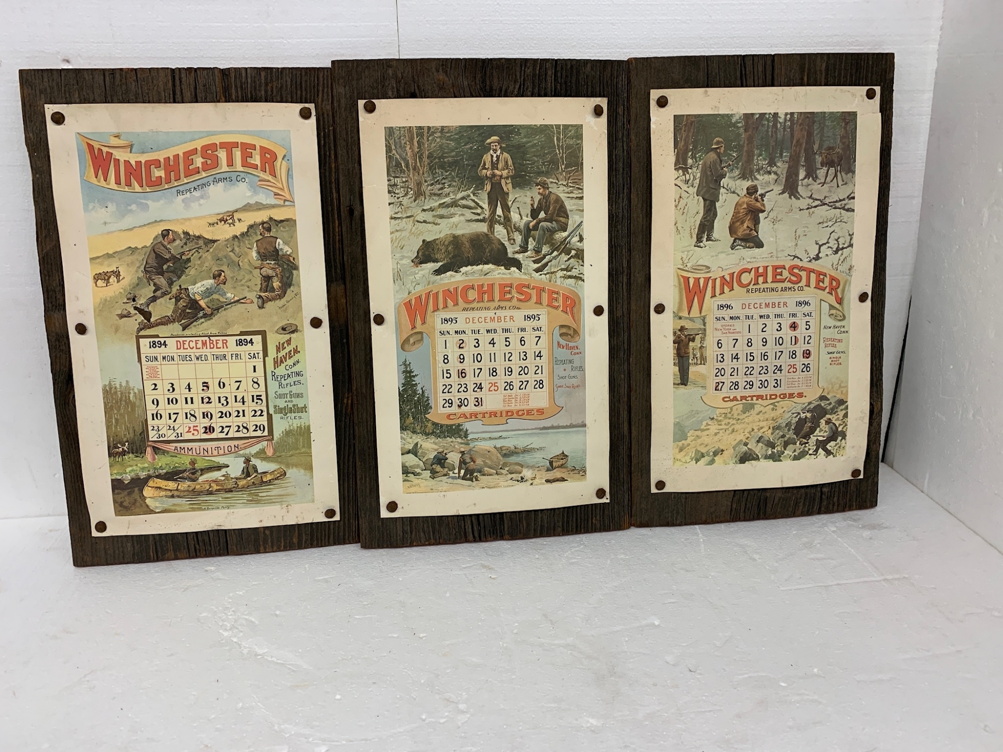 Three Winchester Advertising December Calendars Mounted On Barnboard