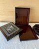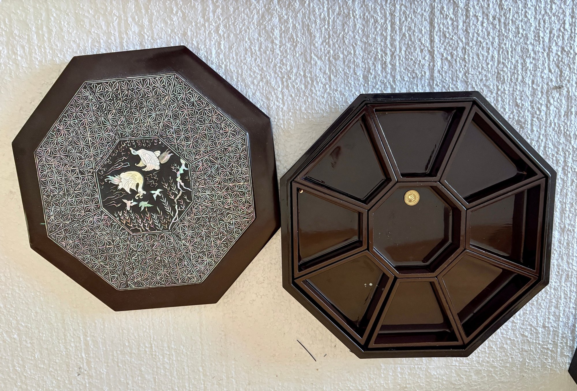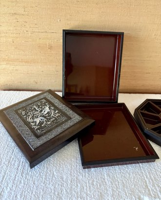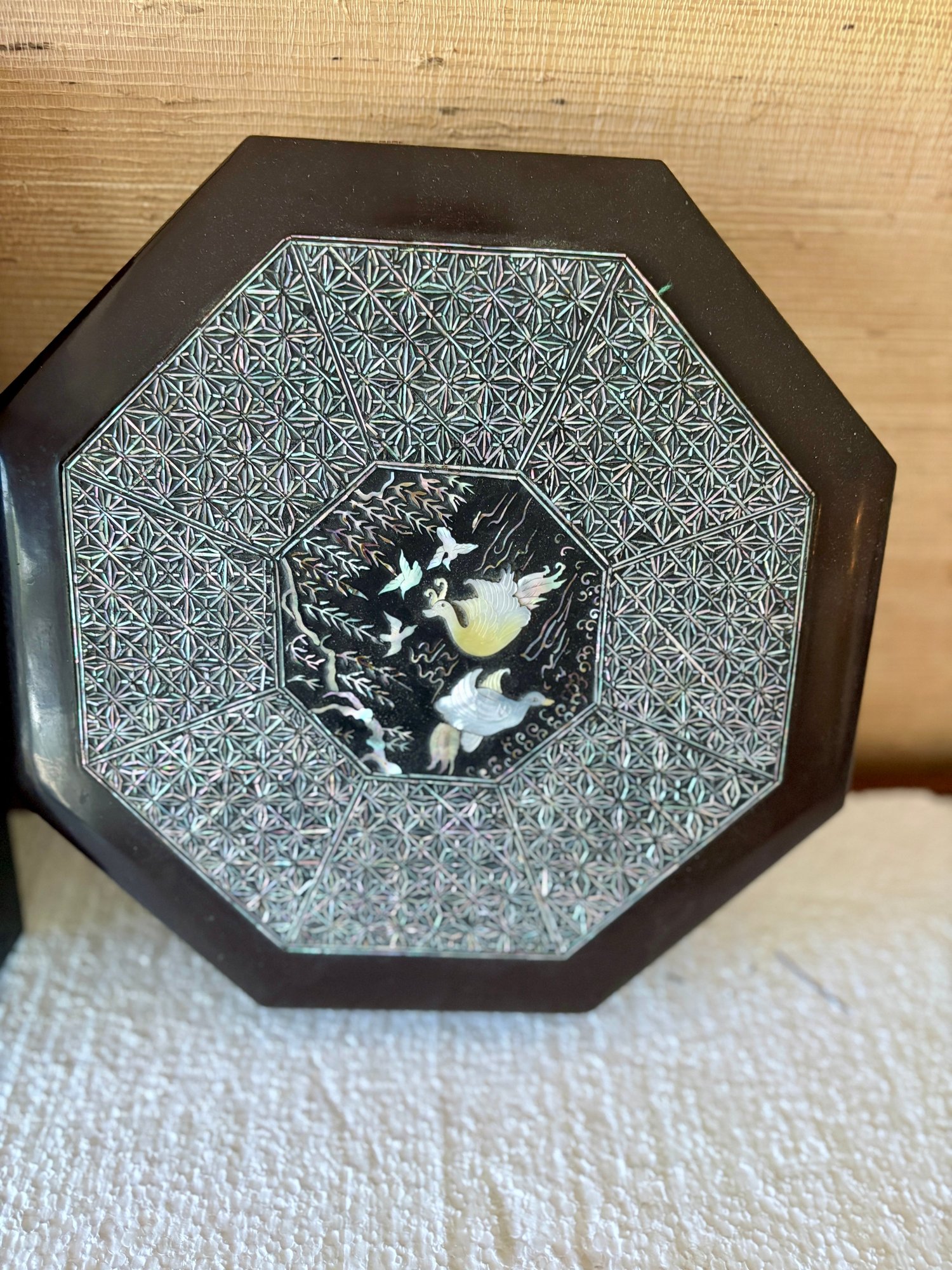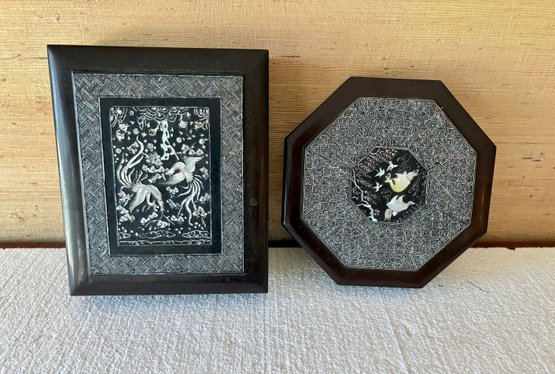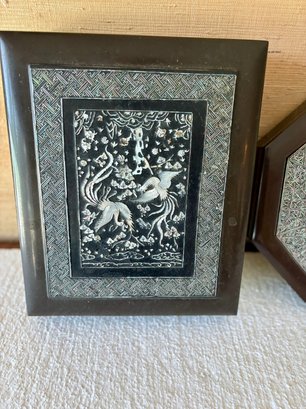Two Black Laquered Mother Of Pearl Decorated Boxes 11x13