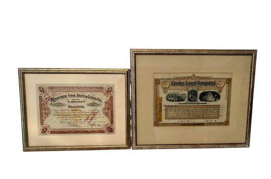 Two Framed Early Land Company Stock Certificates