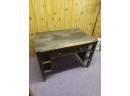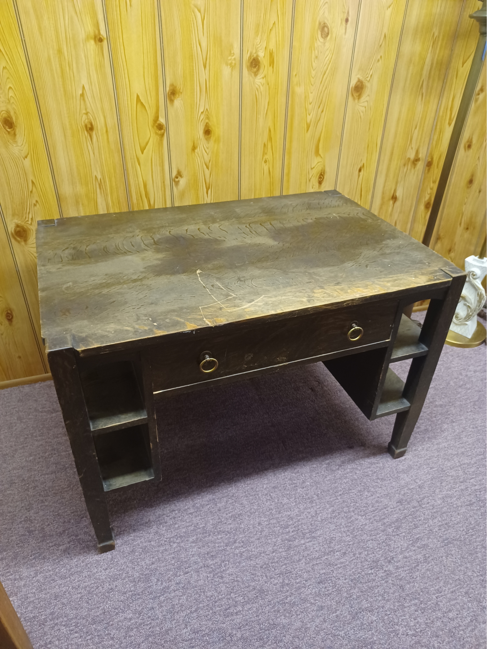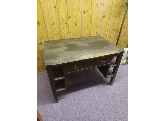Looking for a Desk or Table that will survive the end of the world? This is the desk for you. Made of solid wood from real trees back when we had trees to spare. At a time when size and weight were not an issue this desk/table was born. Has shelves on both sides and a drawer in front to put important things in to get lost. It's big and heavy so bring a helper and a large vehicle to pick it up. 29 inches high, 60 inches wide and 32 inches deep.
