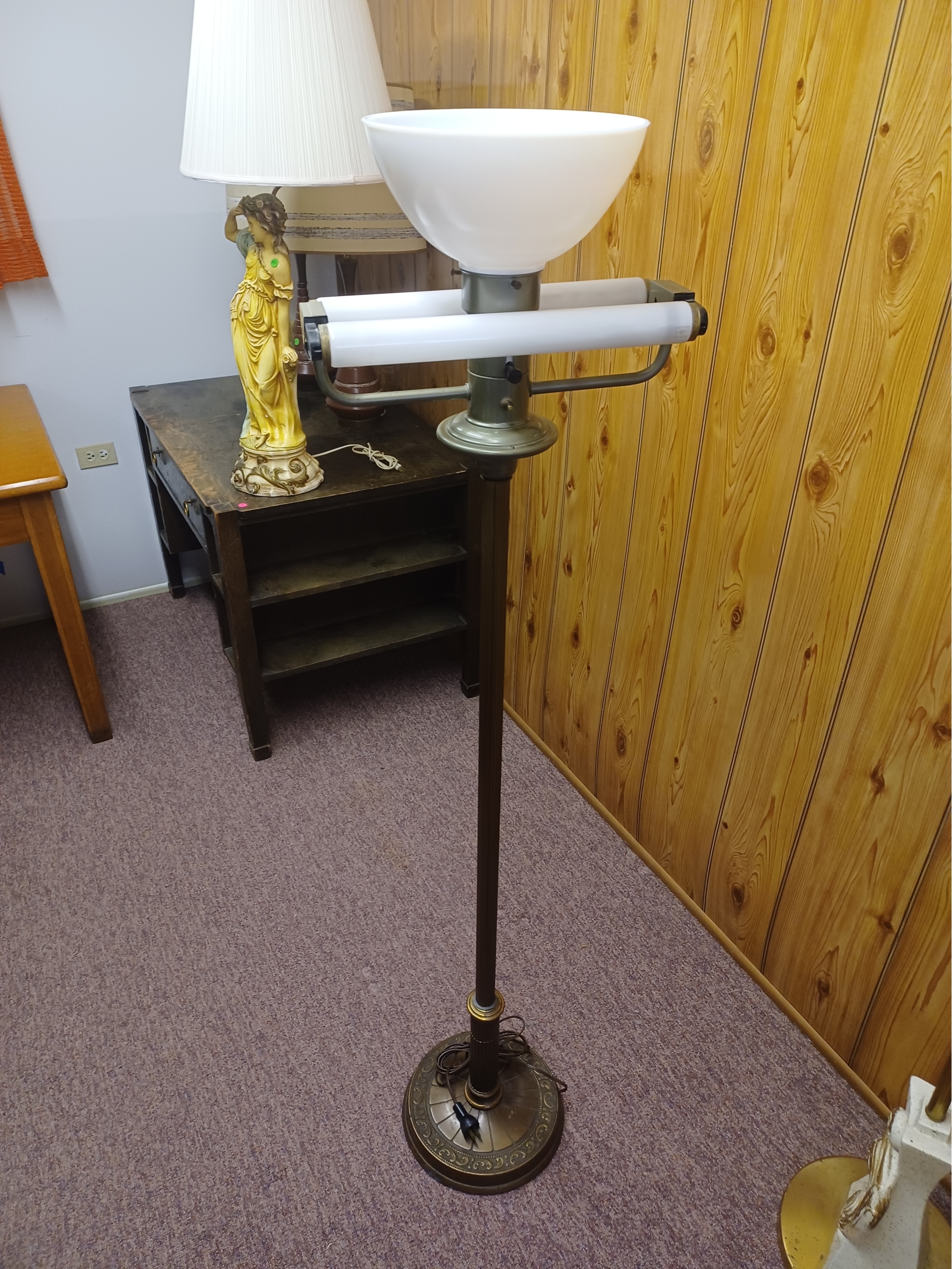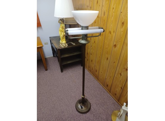 Here is another Lamp project for all you lamp techs out there. It kind of tries to work when you press and hold the power switch but as soon as you let go those fluorescent bulbs shut off. Top bulb is that special bigger socket that we don't have a bulb to so maybe it works and maybe it doesn't. Sold as-is for parts, restoration or decoration. 61 inches high and 11 1/2 inches for the base.