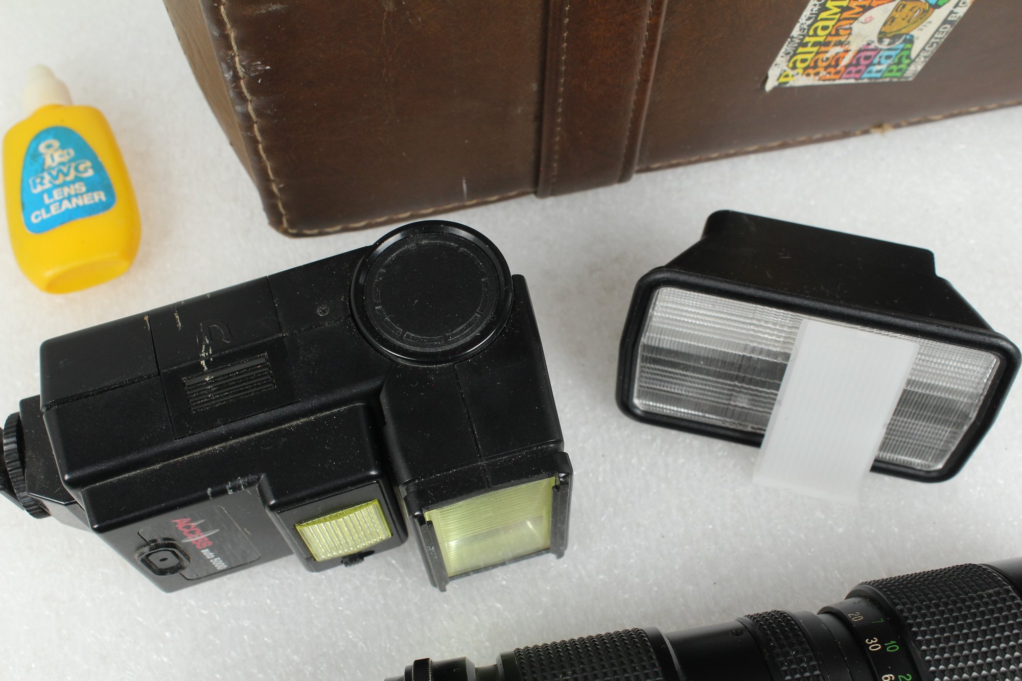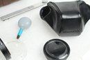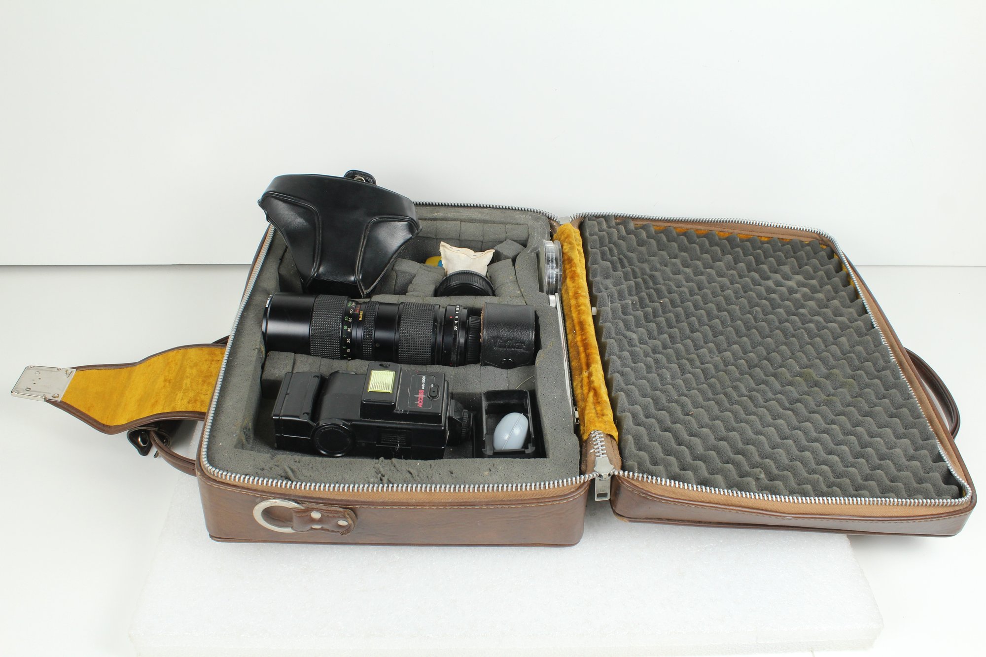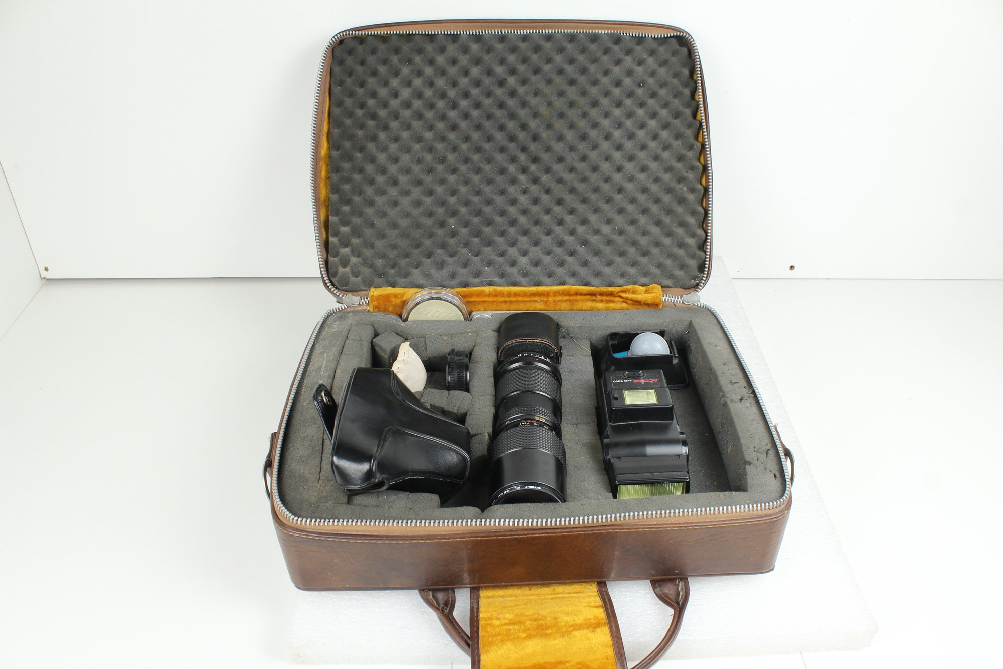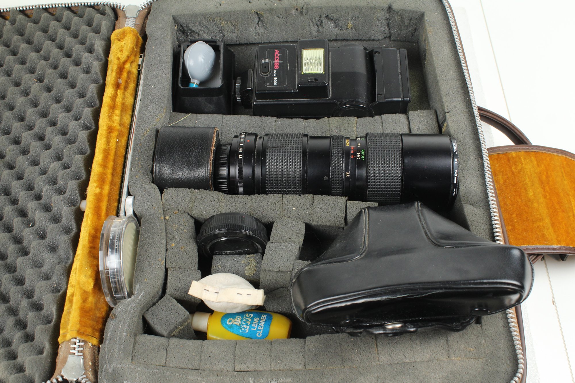 Brown leather latch and zipper large camera case with yellow velvet lining. Contains a ton of accessories for a film camera, including a Vivitar 85-205mm macro zoom lens with Skybolt PL 58mm filter, a Vivitar automatic 2x1 teleconverter lens in case, a Tiffen Haze 1 filter on a Vivitar 49mm to 58mm adapter, a case for an Olympus camera, an Access Auto 5000 flash, and a bunch of little extra bits and pieces. All of these accessories kept secure and safe in removable foam inserts. Case appears to be in good condition; contents are a bit dusty but otherwise seem to be in good shape.