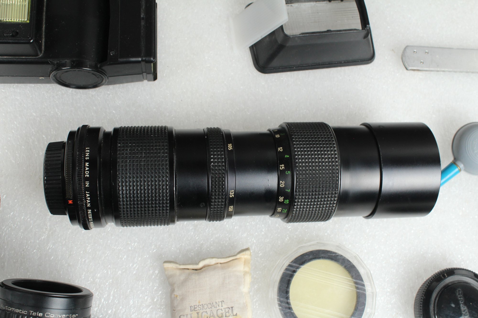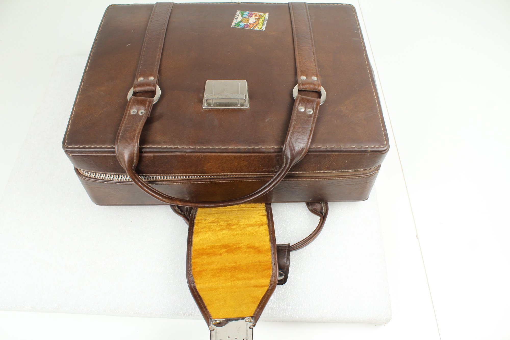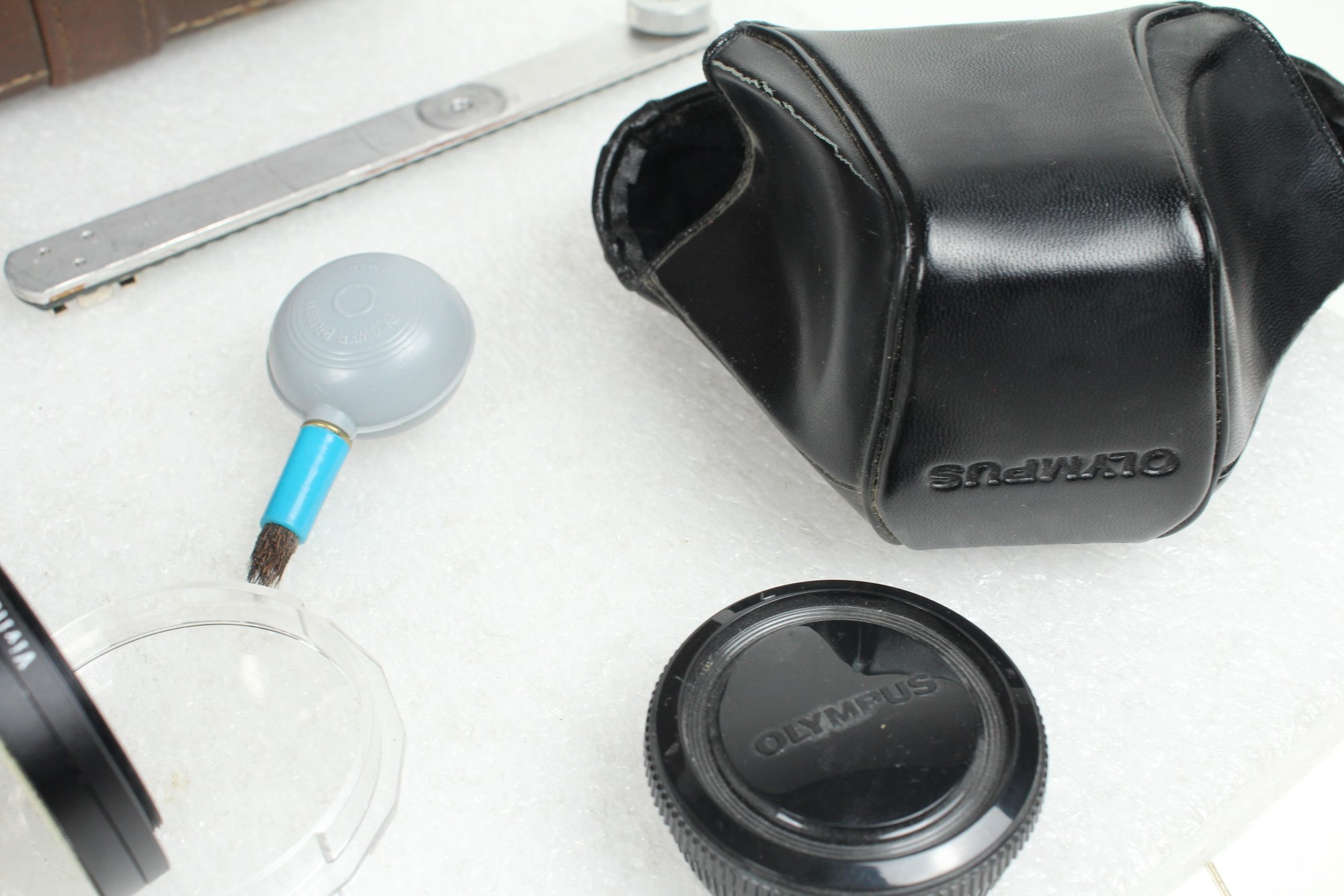 Brown leather latch and zipper large camera case with yellow velvet lining. Contains a ton of accessories for a film camera, including a Vivitar 85-205mm macro zoom lens with Skybolt PL 58mm filter, a Vivitar automatic 2x1 teleconverter lens in case, a Tiffen Haze 1 filter on a Vivitar 49mm to 58mm adapter, a case for an Olympus camera, an Access Auto 5000 flash, and a bunch of little extra bits and pieces. All of these accessories kept secure and safe in removable foam inserts. Case appears to be in good condition; contents are a bit dusty but otherwise seem to be in good shape.