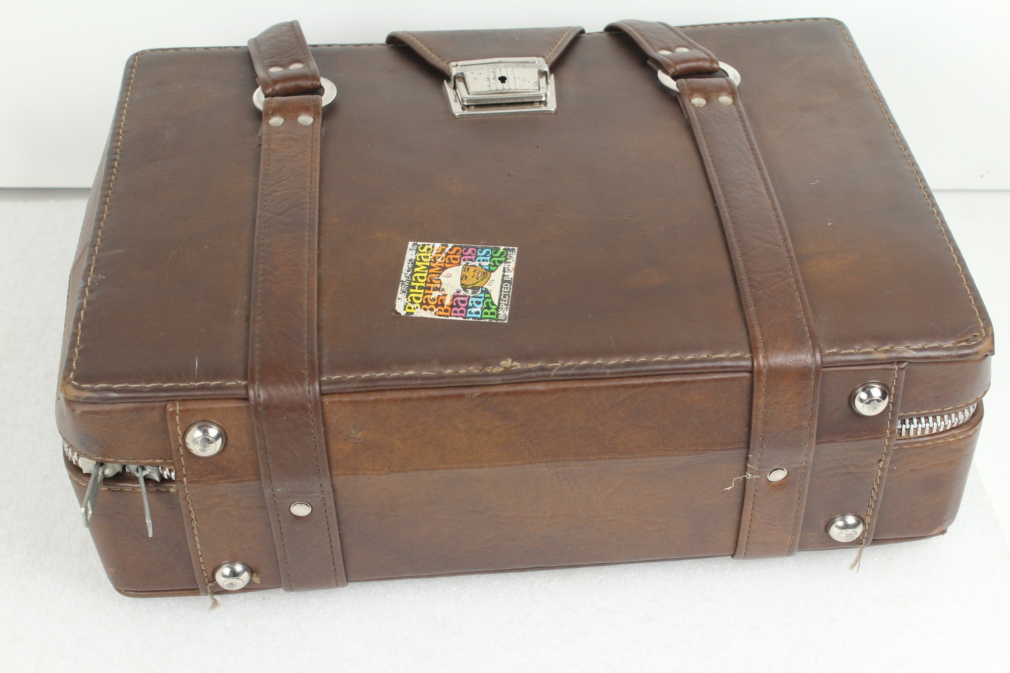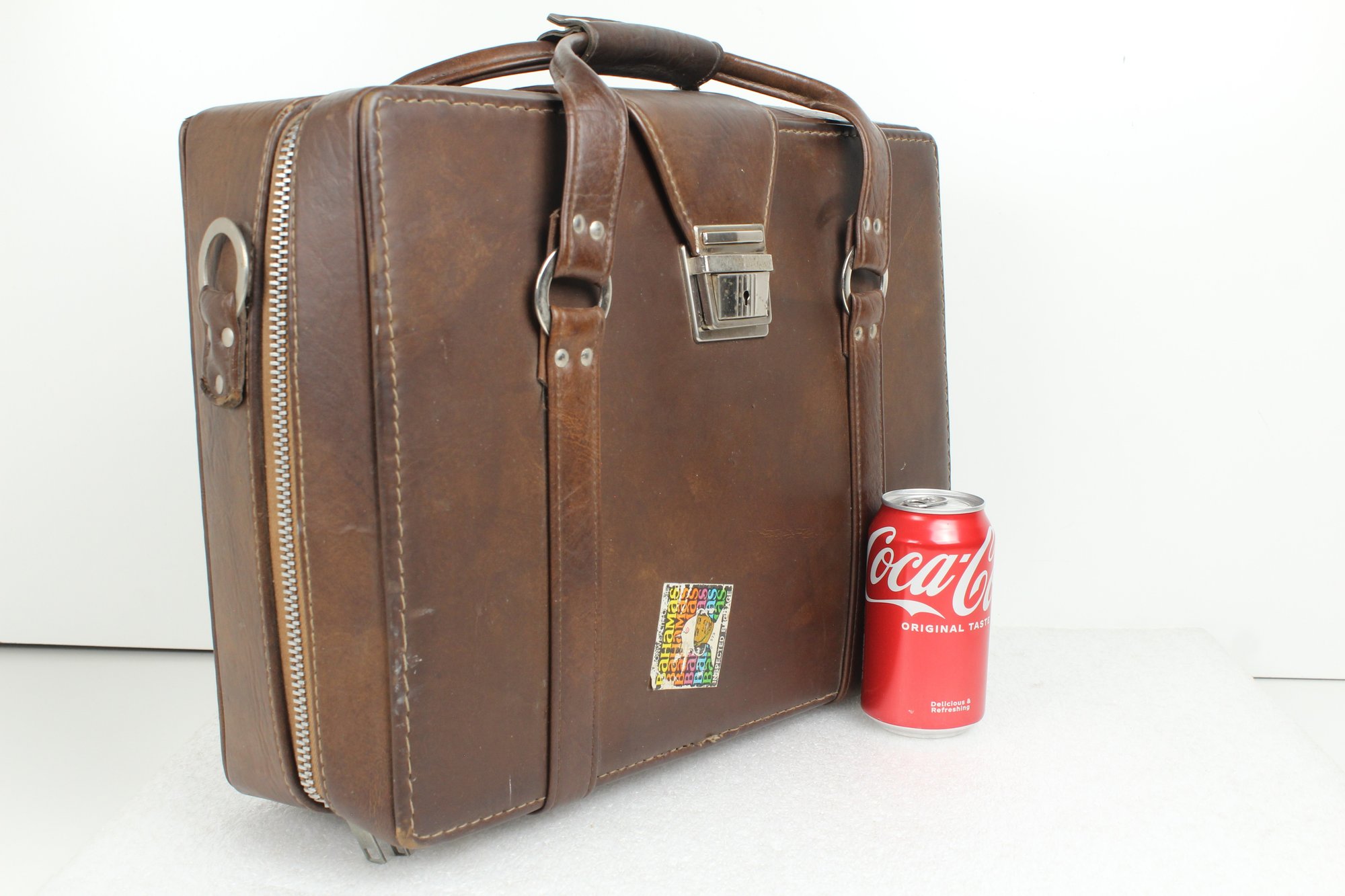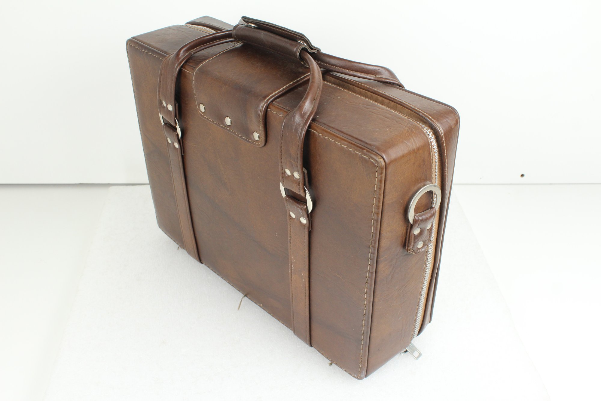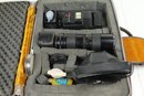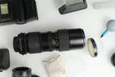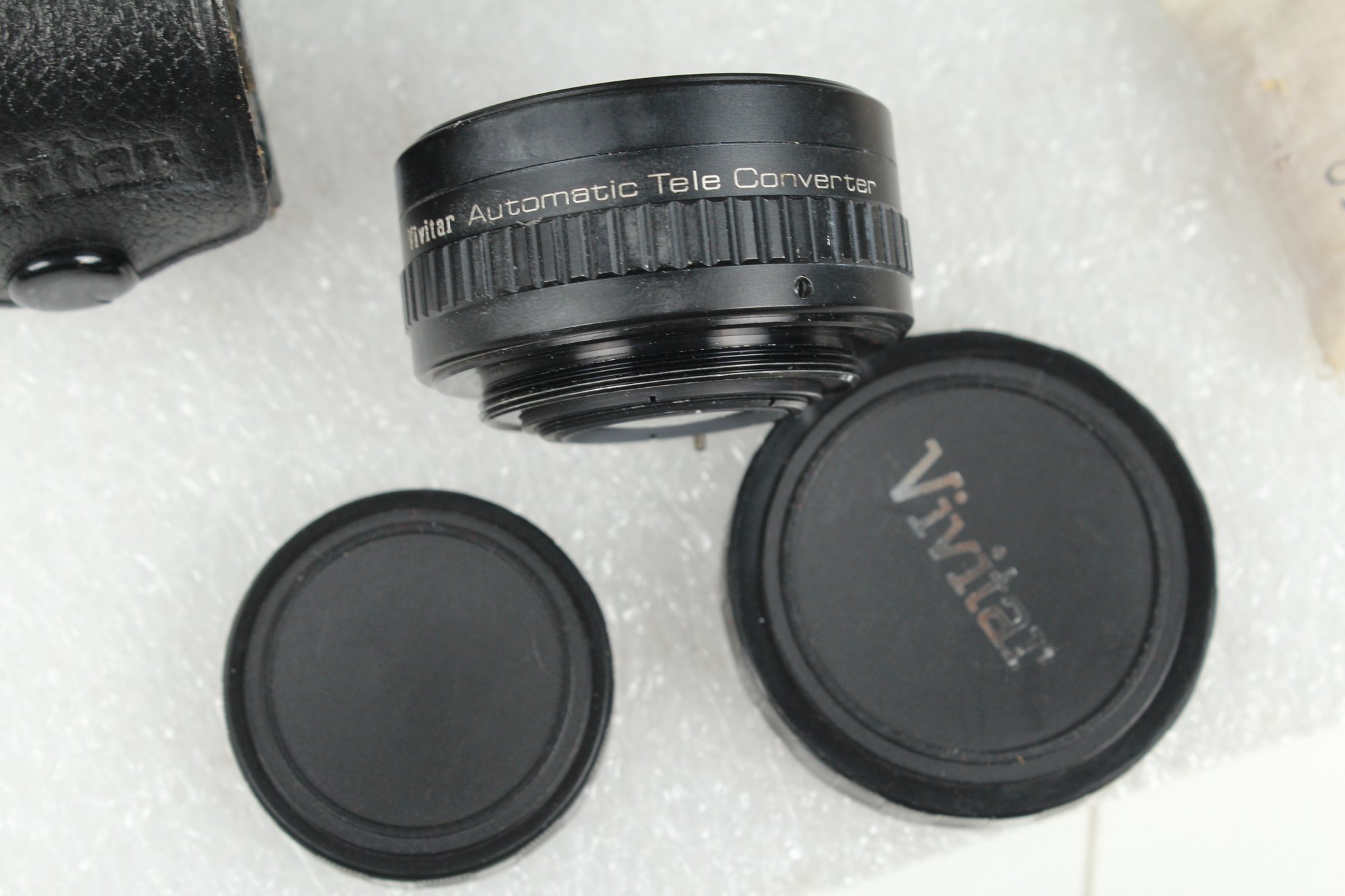 Brown leather latch and zipper large camera case with yellow velvet lining. Contains a ton of accessories for a film camera, including a Vivitar 85-205mm macro zoom lens with Skybolt PL 58mm filter, a Vivitar automatic 2x1 teleconverter lens in case, a Tiffen Haze 1 filter on a Vivitar 49mm to 58mm adapter, a case for an Olympus camera, an Access Auto 5000 flash, and a bunch of little extra bits and pieces. All of these accessories kept secure and safe in removable foam inserts. Case appears to be in good condition; contents are a bit dusty but otherwise seem to be in good shape.