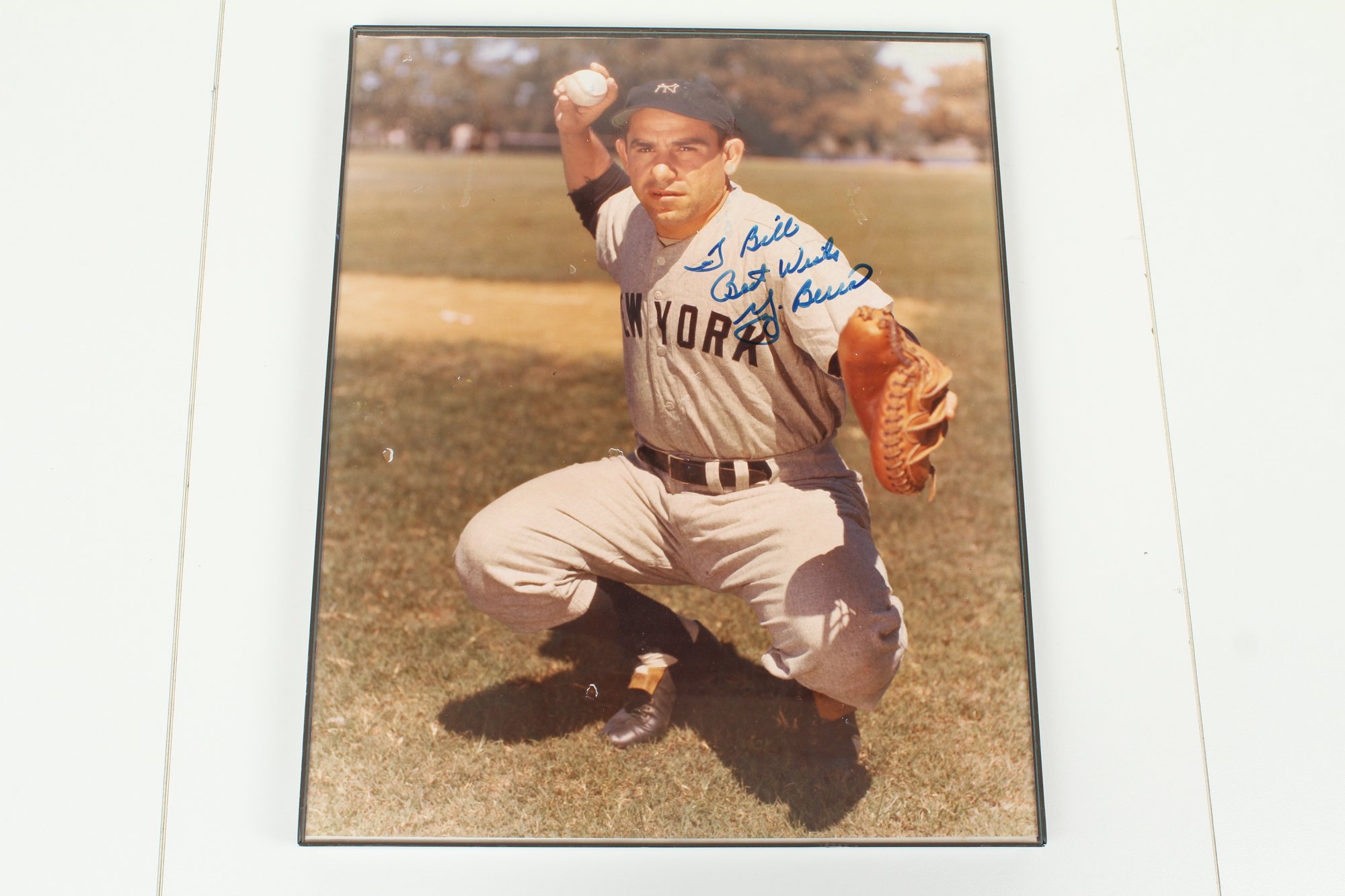 Signed "To Bill Best Wishes Yogi Berra". No COA. Photo measures 10" x 8" with the frame 1/8th inch greater on both dimensions. There are 2 small tears in the photo.