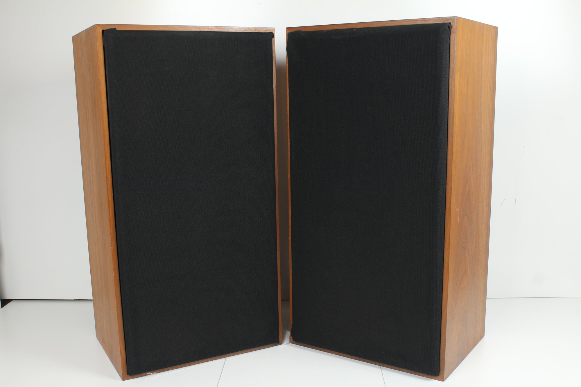 Both speakers are working and all drivers are working. Both speakers sound amazing! Grills have been recovered and have loose cloth in the corners. Velcro has been glued on the speakers to hold the grills on. Each speaker measures 13 inches wide, 10 inches deep and 24 3/4 inches tall.