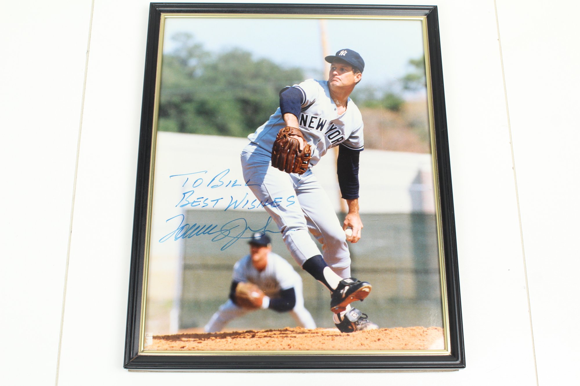 Signed "To Bill Best Wishes Tommy John". No COA. Photo measures 10" x 8" with the frame 1/8th inch greater on both dimensions. Photo labeled with MLB Licensee logo.