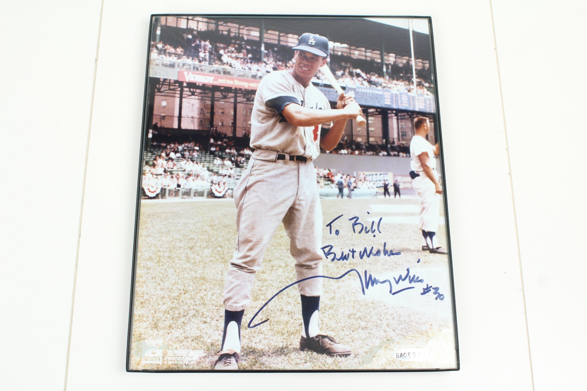 Signed "To Bill Best Wishes Maury Wills #30". Photo measures 10" x 8" with the frame 1/8th inch greater on both dimensions. Photo labeled with Cooperstown Collection and 2000 Photo File, Inc. It also has the holographic sticker in the lower right corner indicating signature is authentic.