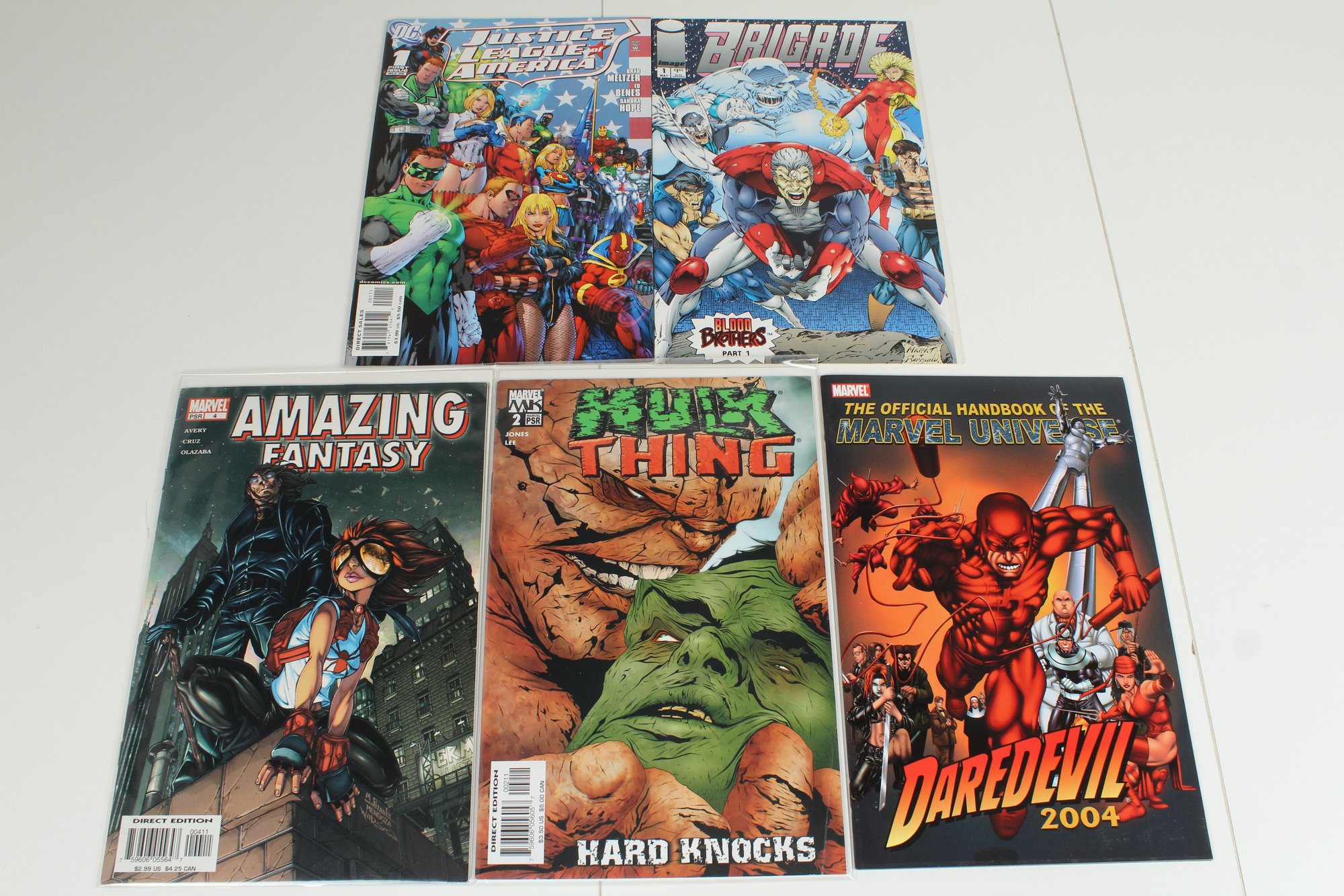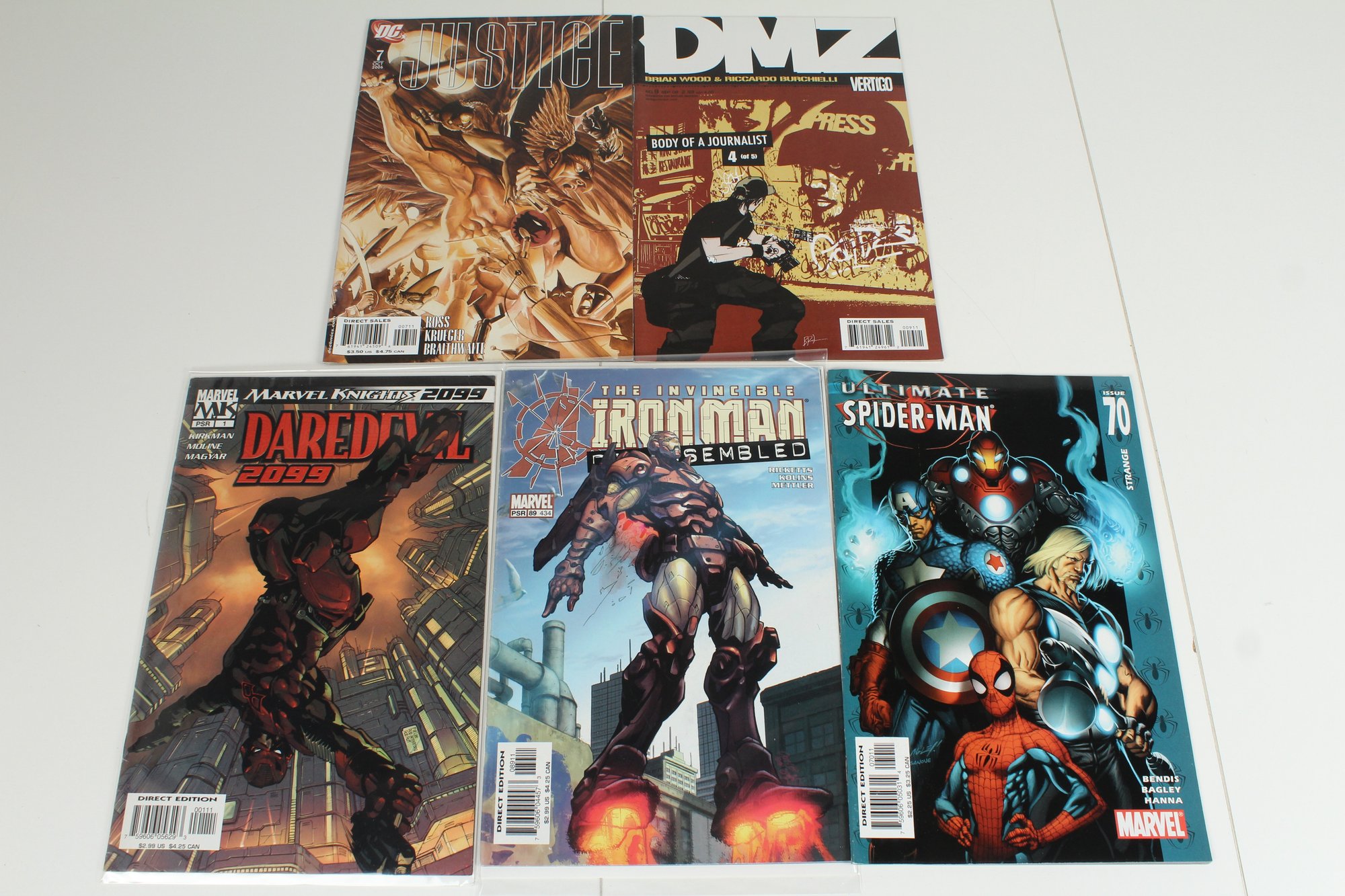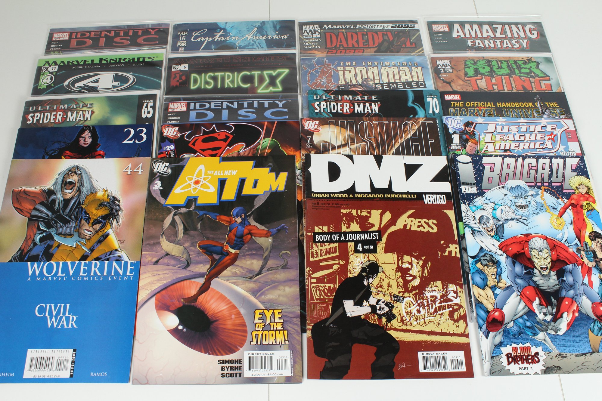 This is a lot of 20 assorted comics. Features Superman, Captain America, Marvel, Ironman, Spiderman, Justice League & More. All comics are in good condition, great reader copies. May have some damaged corners and wear. Ten comics are bagged and backed. Please see photos for condition