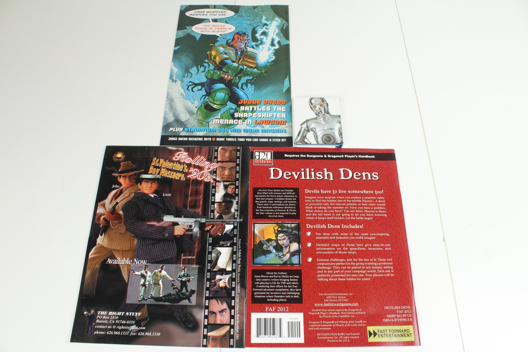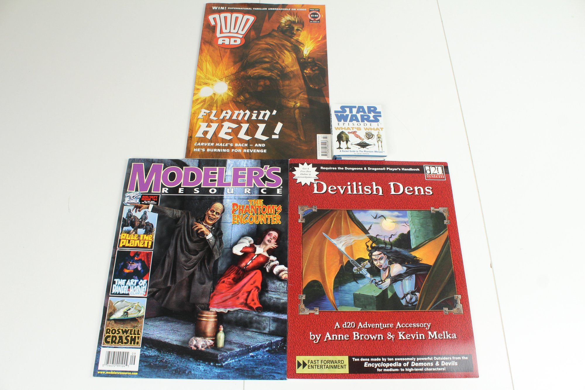 This is a lot of 3 magazines and 1 Mini Book. Includes 2000 AD, D&D Den Accessory, Modeler's & Star Wars mini book.. Items are in good condition and may have some normal wear and tear. Please See photos for condition
