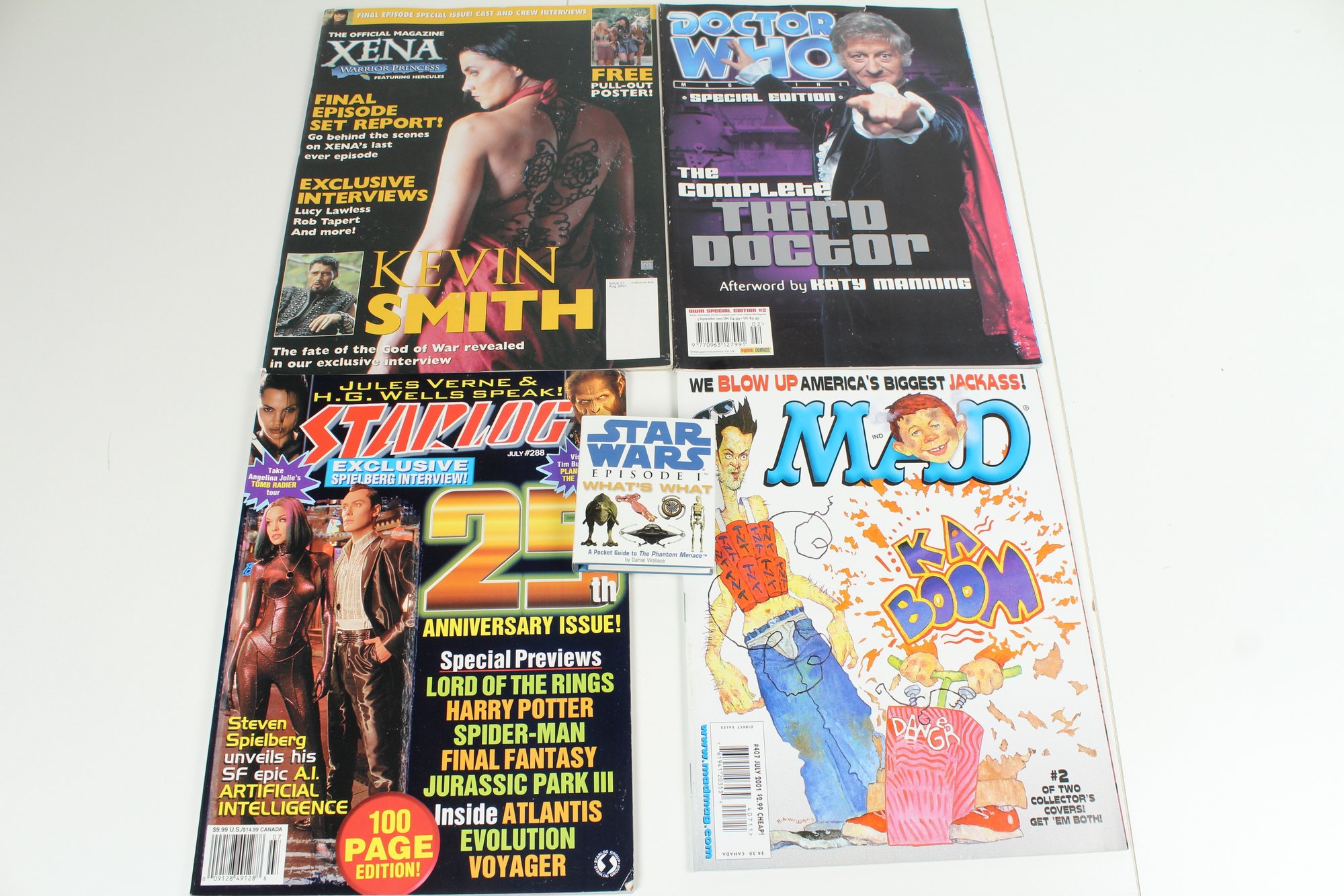 This is a lot of 4 magazines and 1 Mini Book. Includes Doctor Who, MAD Magazine, Xena, Starlog & Star Wars mini book. Items are in good condition and may have some normal wear and tear. Please see photos for condition.