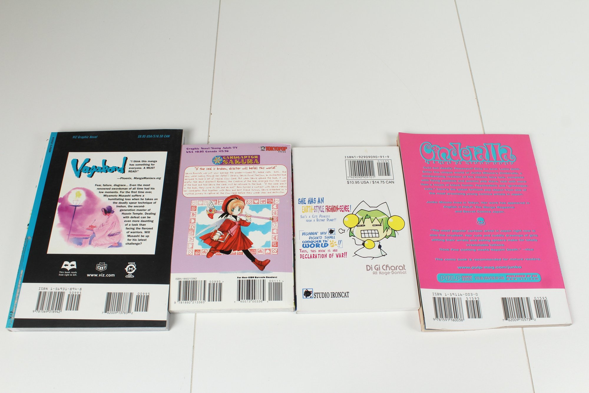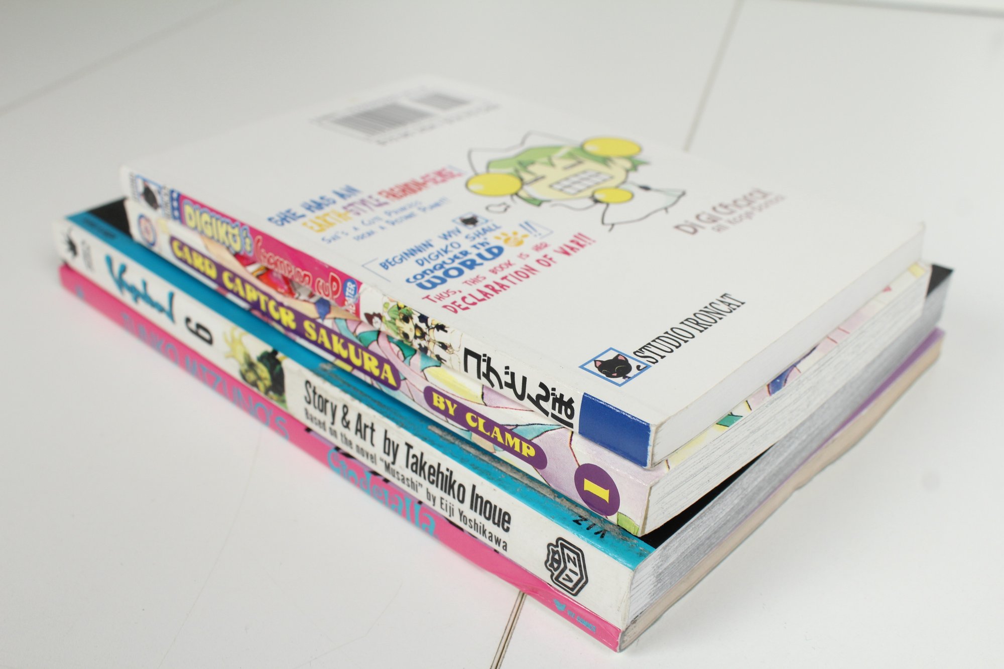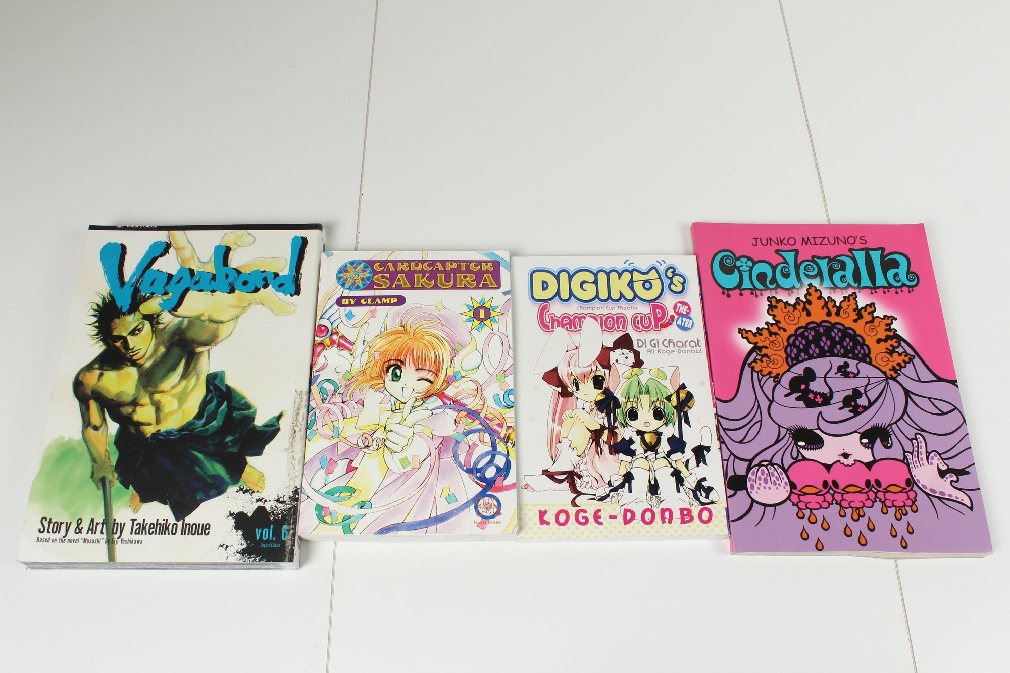 Includes Four Manga books. Includes CardCaptor Sakura, Vagabond, Dikiko, Jumko Mizuno. Books are good condition may have some normal wear and tear. CardCaptor does have a bent spine. Please see photos for condition