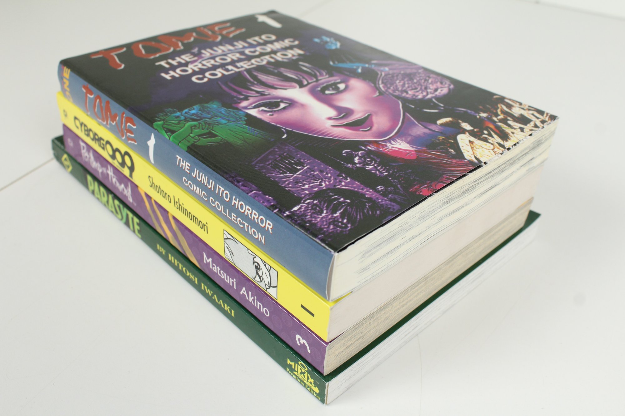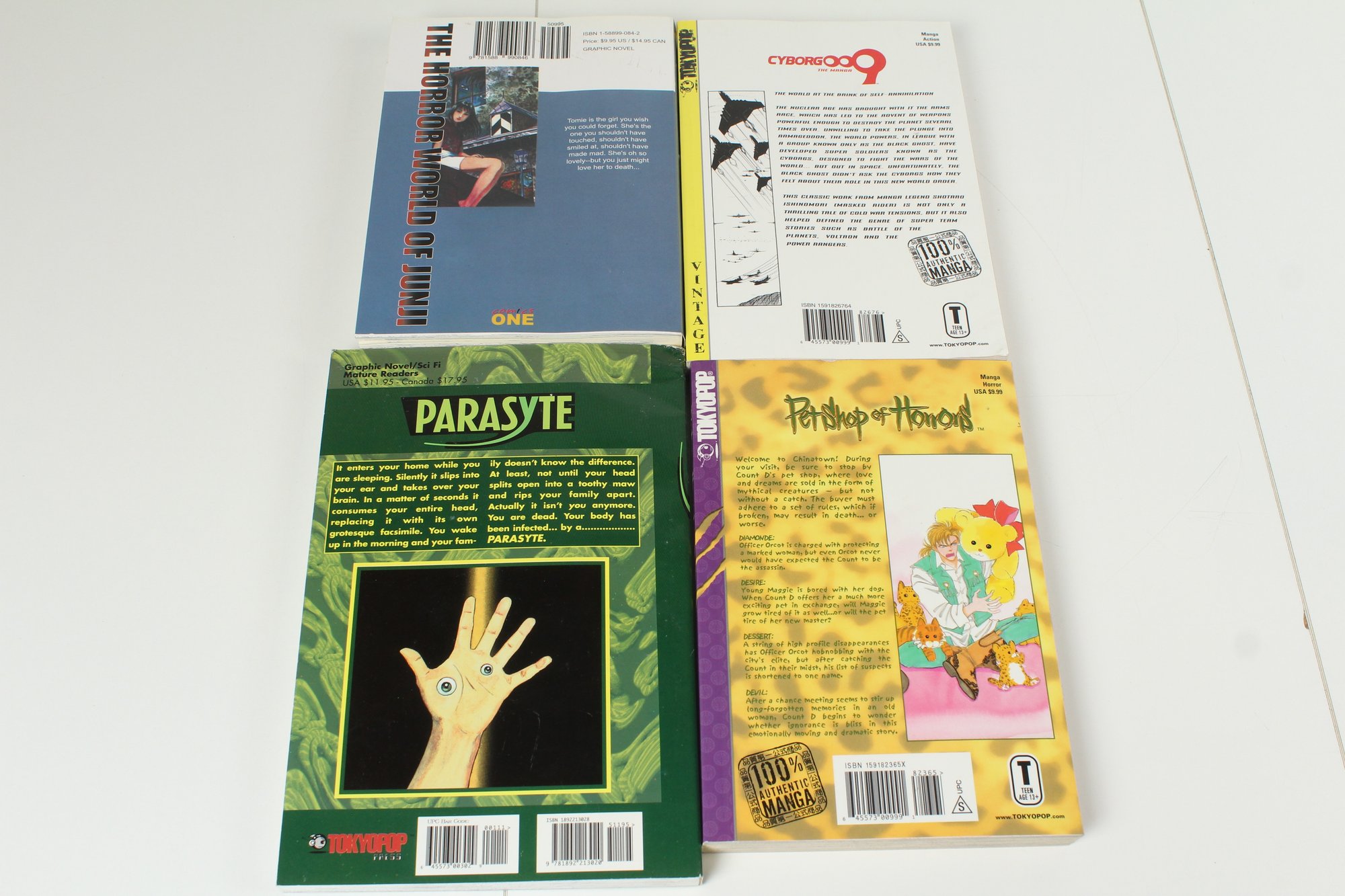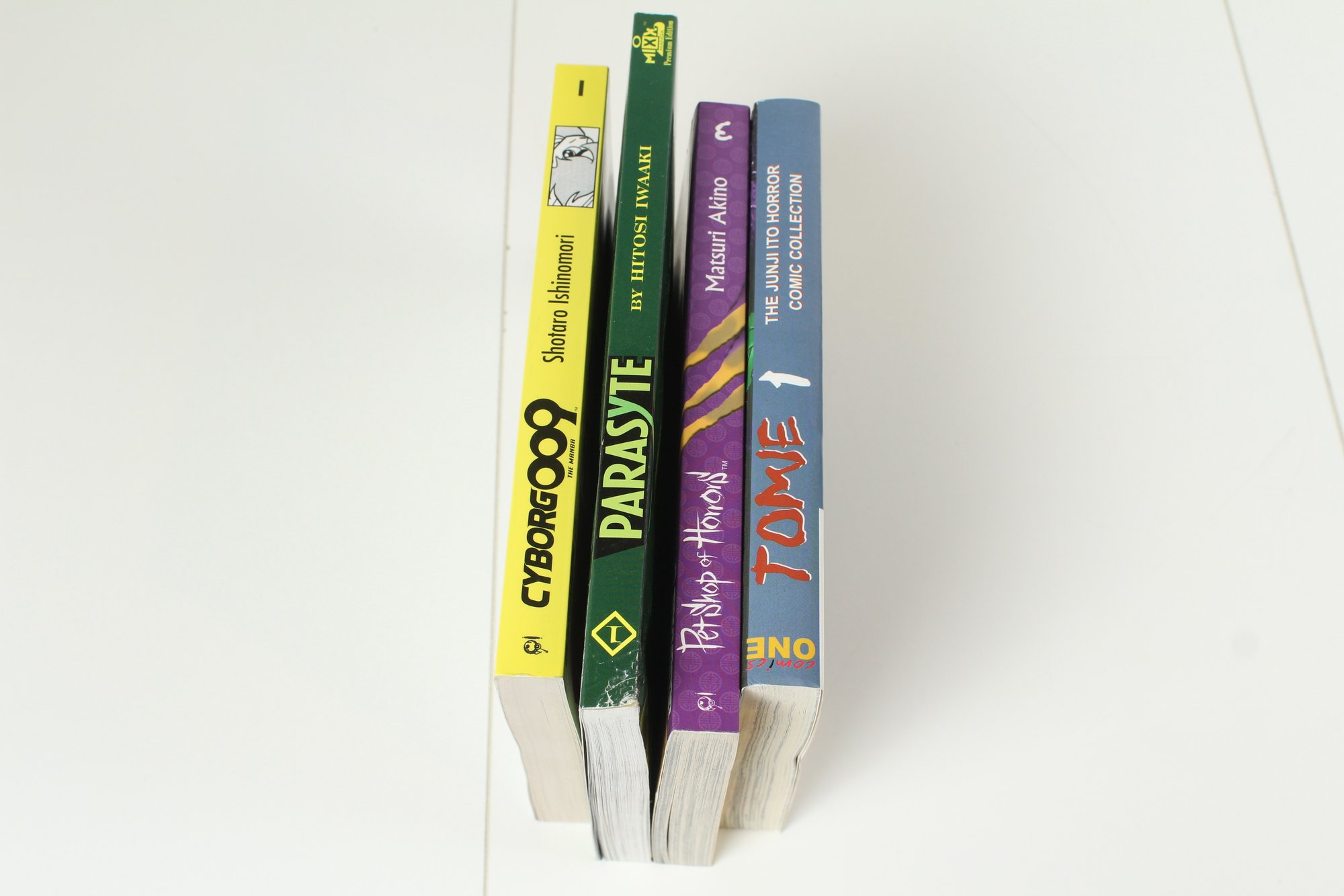 Includes Four Manga books. Includes Petshop of Horrors, Parasyte, Cyborg009 & Junji Ito Horror Collection. Books are good condition may have some normal wear and tear. Parasyte has a bent corner at the spine. Please see photos for condition