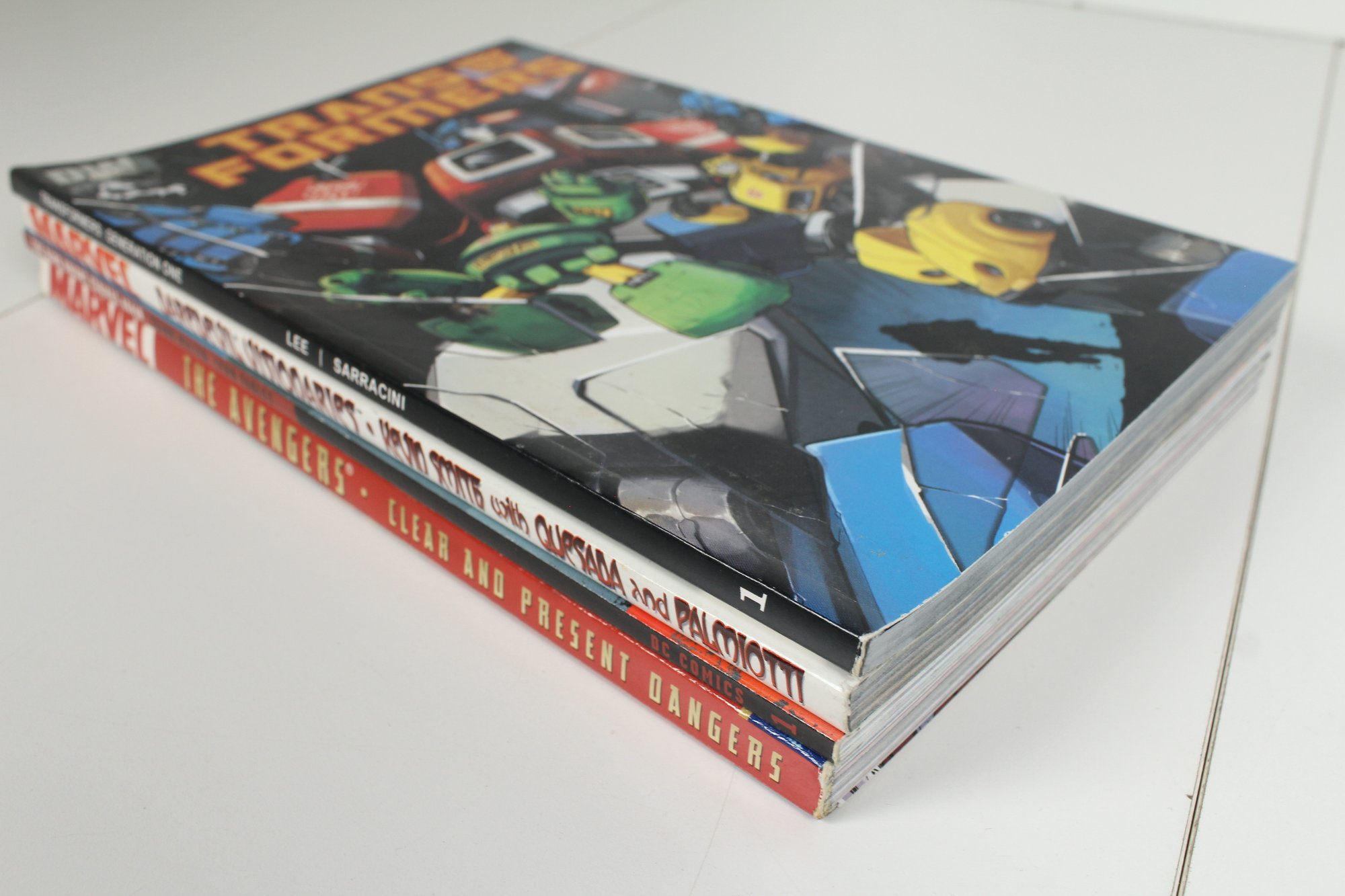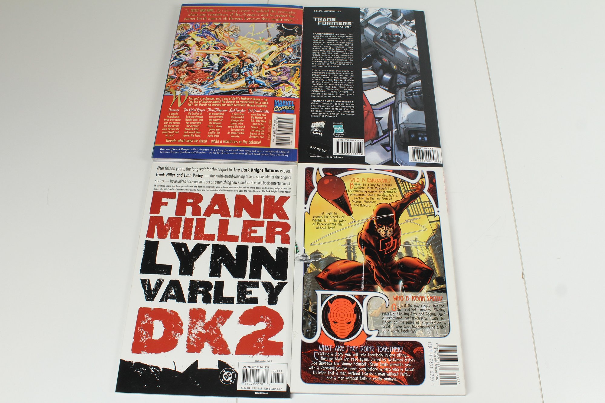 Lot of 4 Graphic Novels. Includes Dark Knight 2, Daredevil, Avengers, & Transformers. Books are good condition may have some normal wear and tear. Please see photos for condition