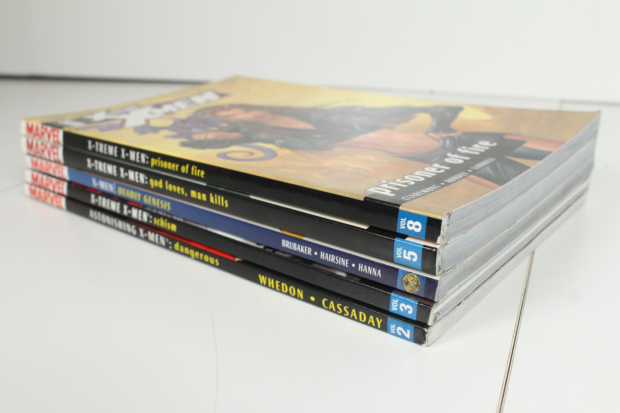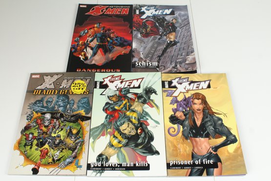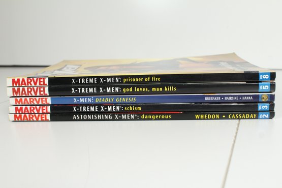 This lot includes 5 X-Men books. X-Men Deadly Genesis, X-treme X-Men God Loves, Man Kills, X-treme X-Men Prisoner of Fire, Astonishing X-Men Dangerous, X-treme X-Men Schism. Please see photos for condition
